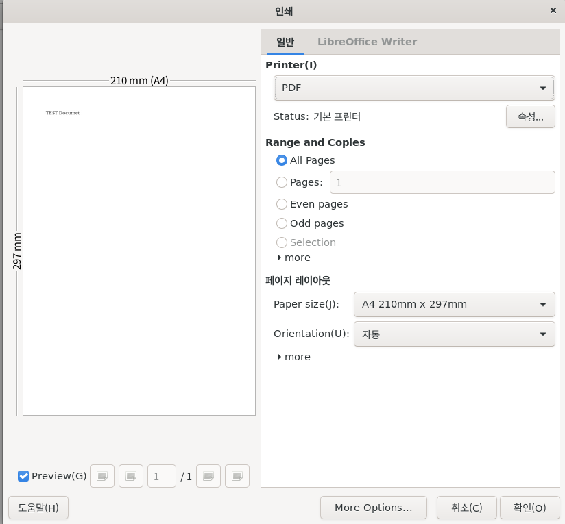 프린터 드라이버가 준비되었으니 이제 바로 인쇄 테스트를 수행하면 된다. 필자는 리브레오피스를 열고 문서 인쇄를 수행했다. 인쇄를 선택하면 대화창의 프린터 선택에서 설치한 PDF 프린터를 선택하면 된다.
