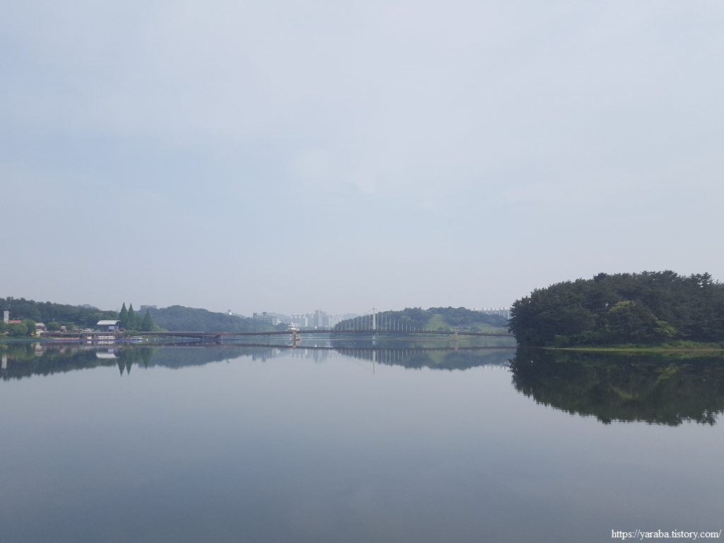 이른 아침의 상쾌한 공기를 마시며 거울과 같은 청명한 호수 위를 걸어간다. 멀리 호수 위를 가로지르는 물빛다리도 보이기 시작한다.