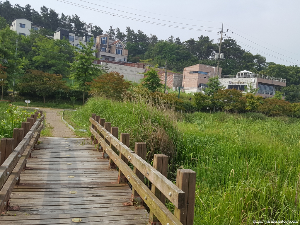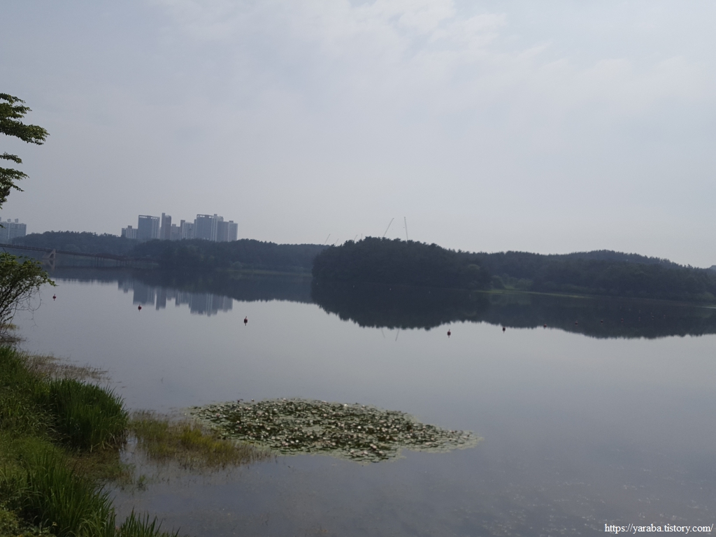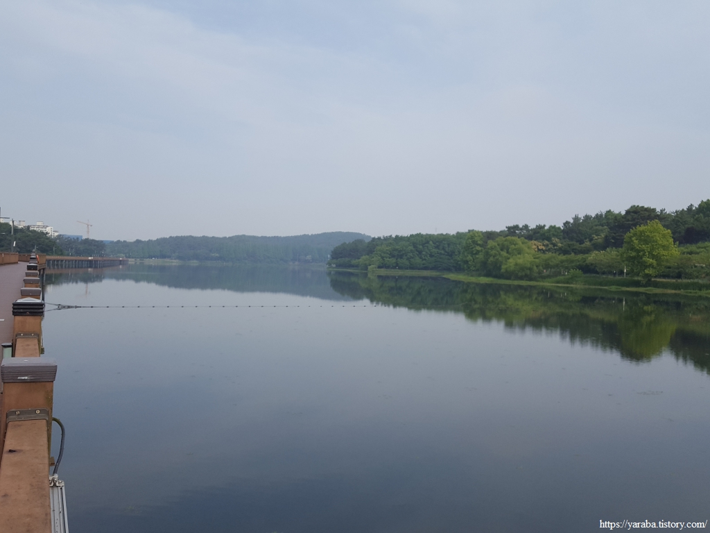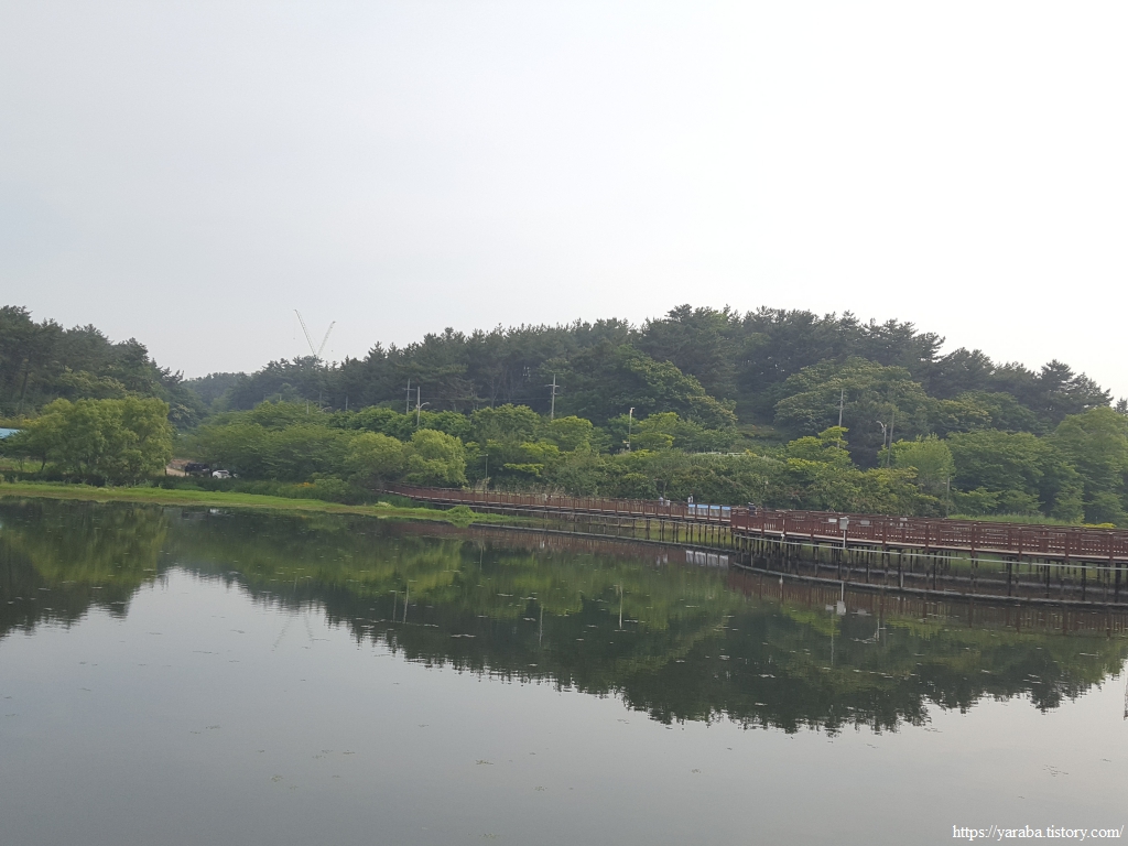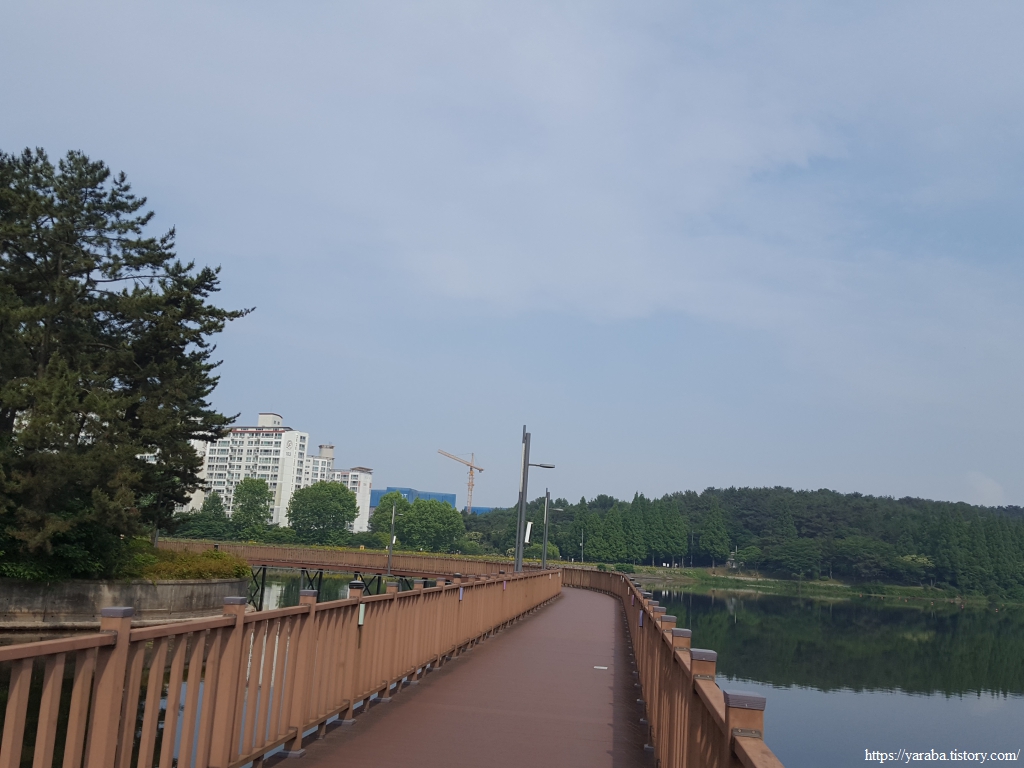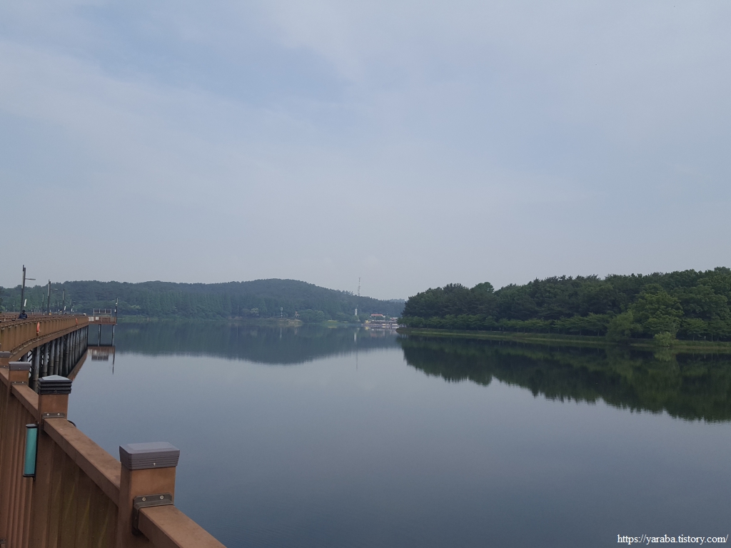 원래의 서해랑길은 초반에 호수를 건너가서 호수 건너편의 산책로를 걷다가 호수 중간에 있는 물빛다리로 호수를 다시 건너오는데 어찌하다 보니 호수 위 데크길을 직진하고 있었다. 어차피 직진해도 물빛다리와 만나므로 계속 직진하여 호수 위 데크길을 걷기로 했다.