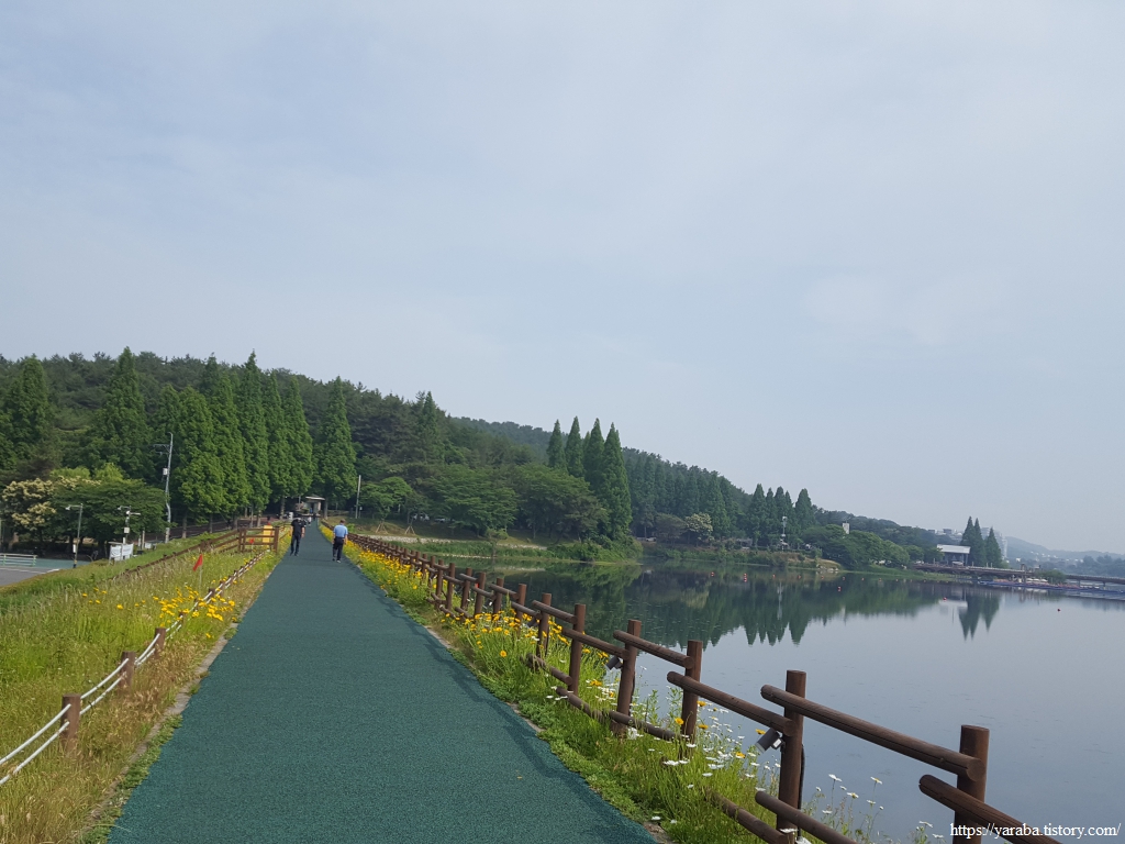 호수 위를 걷던 데크길은 둑방길로 나간다.