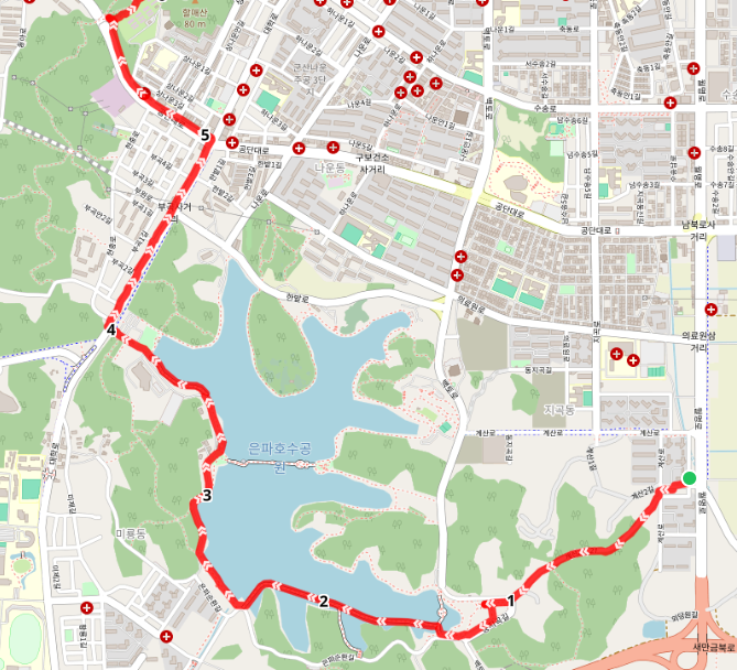 언덕길을 내려온 길은 은파호수공원으로 진입한다. 은파호수공원의 원래 이름은 미제저수지, 즉, 쌀을 키우기 위한 물을 가두어 놓은 곳이란 의미였다고 한다.