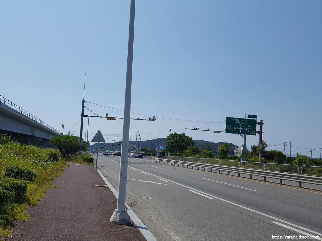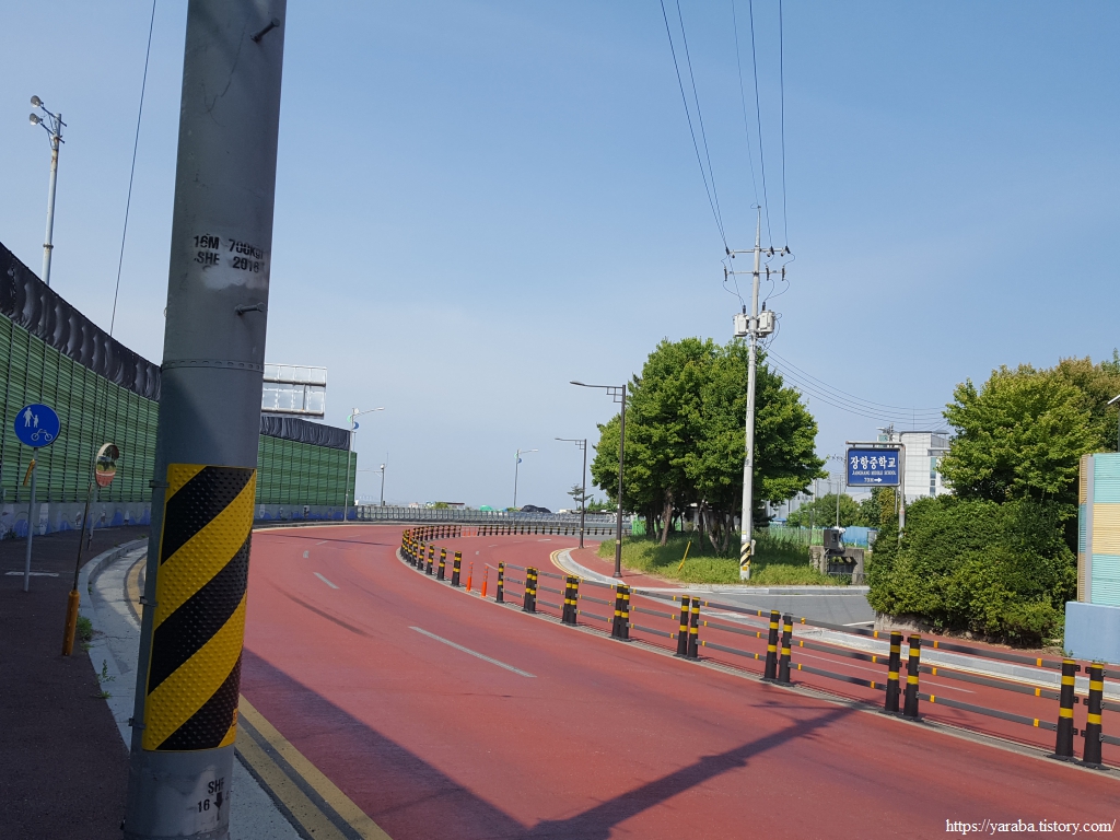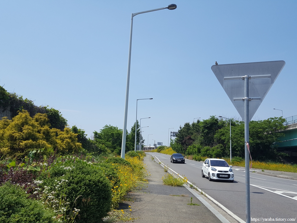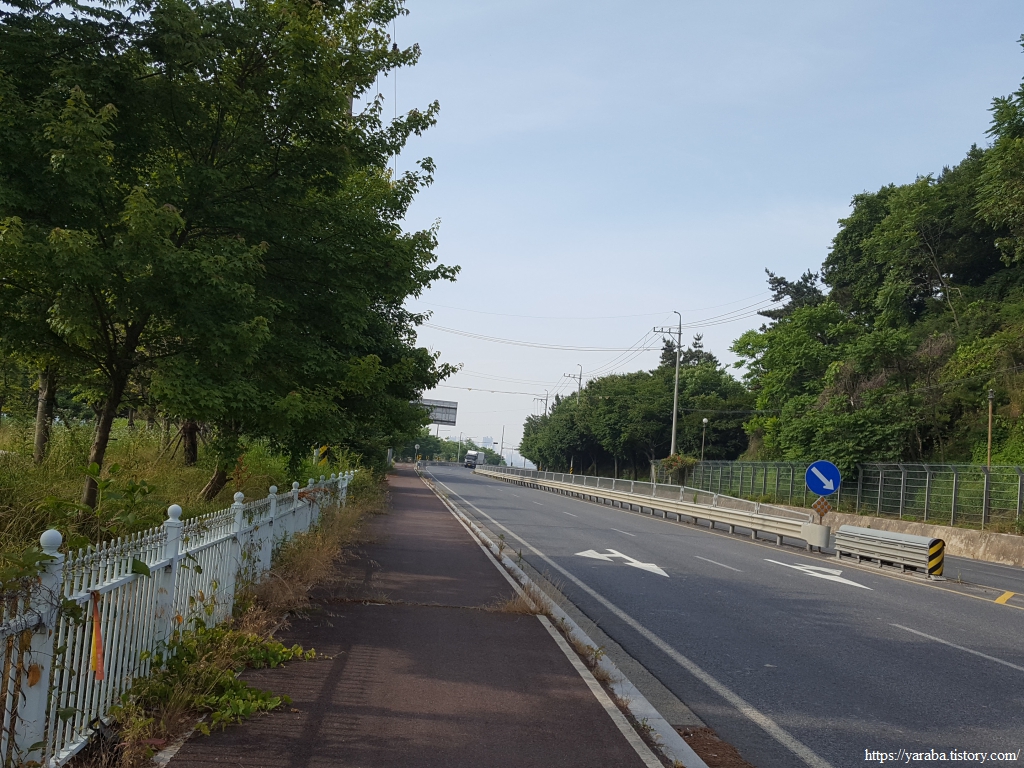 길은 서천 국민여가캠핑장 옆을 지나서 장산로 도로를 따라 계속 내려간다. 종점까지 계속 도로변을 걷는다고 보면 된다.