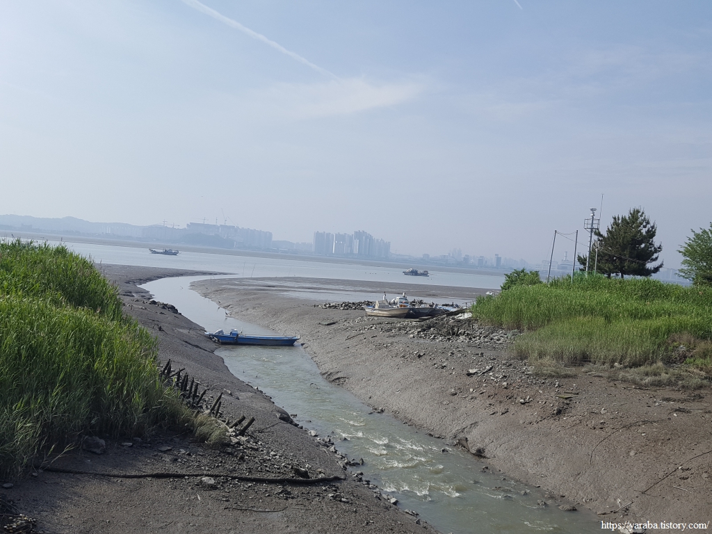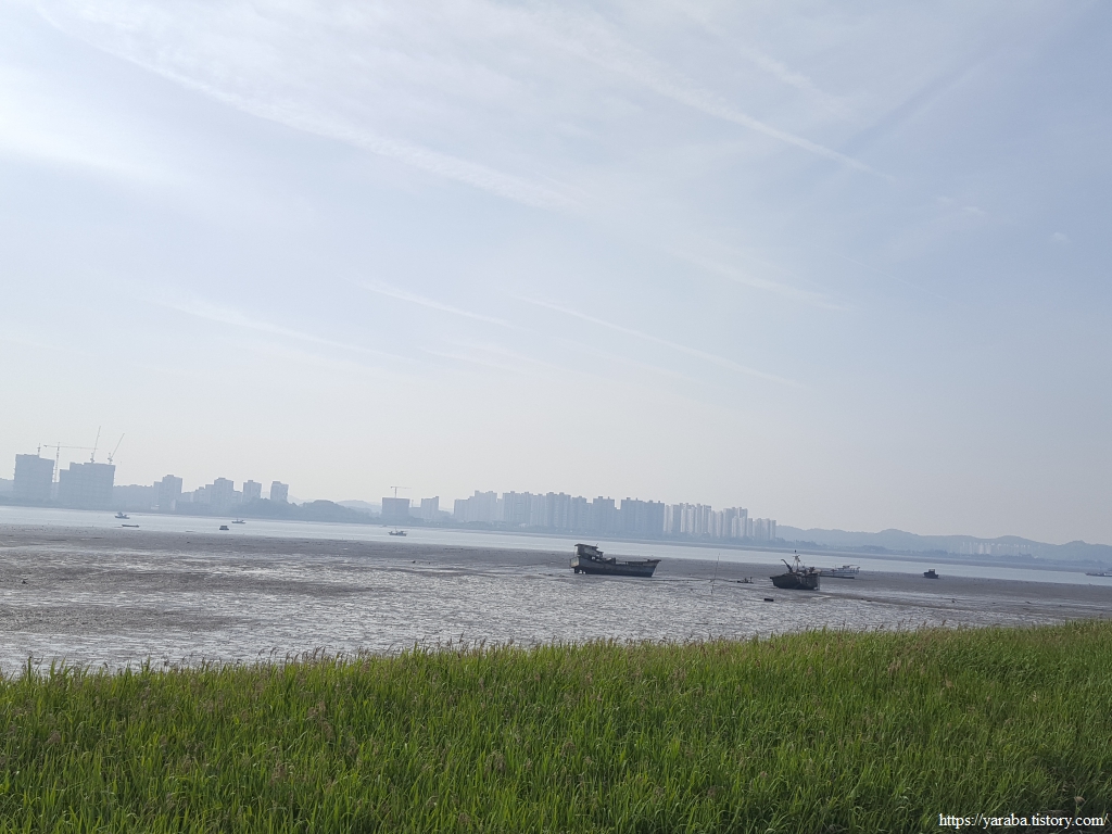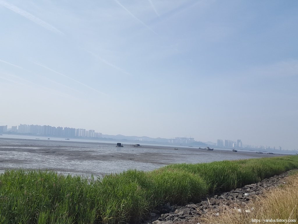 강 건너 군산이 아득하게 보인다. 바로 앞으로 물 밖으로 드러난 갯벌이 있기는 하지만 강 건너 아파트 스카이라인은 서울이나 군산이나 다르지 않다.