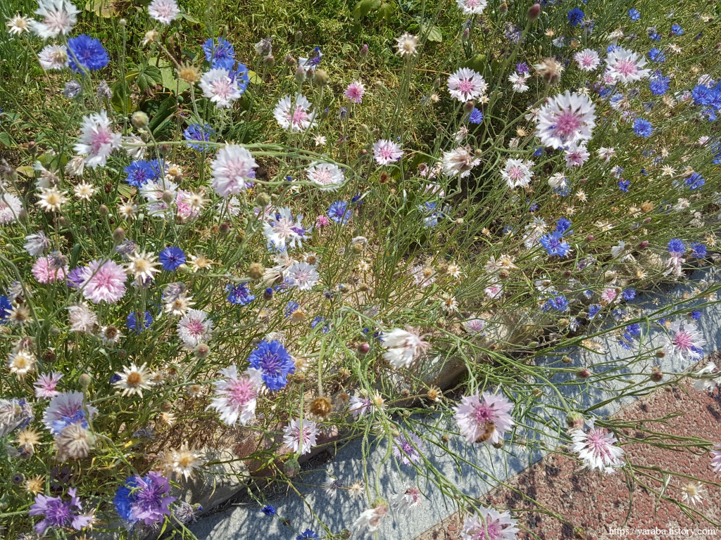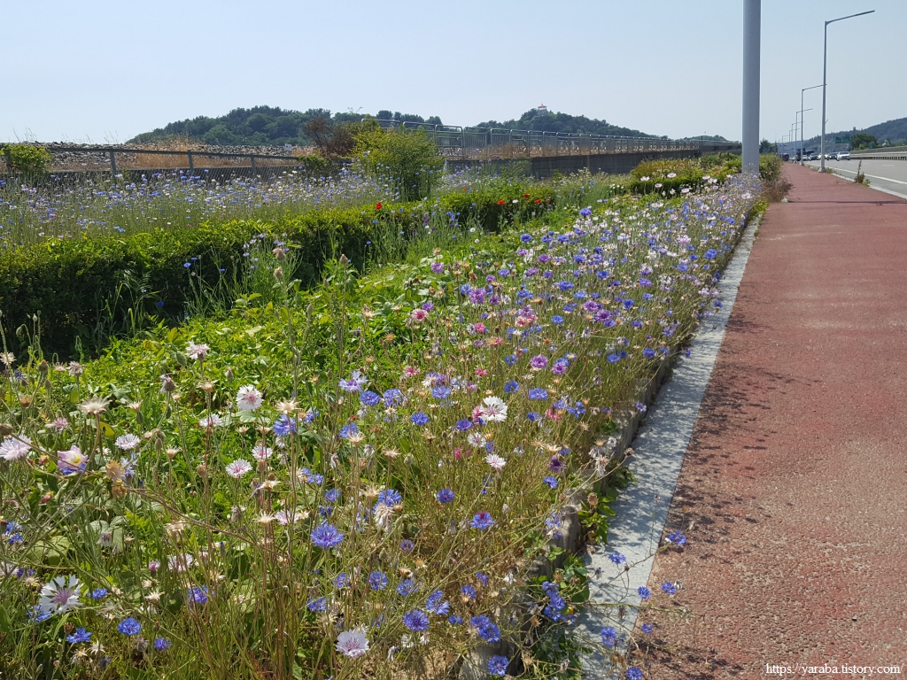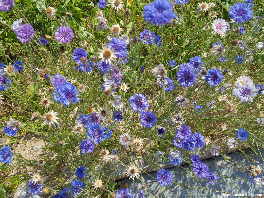 인도 옆으로 유럽 원산의 수레국화가 화사하다.