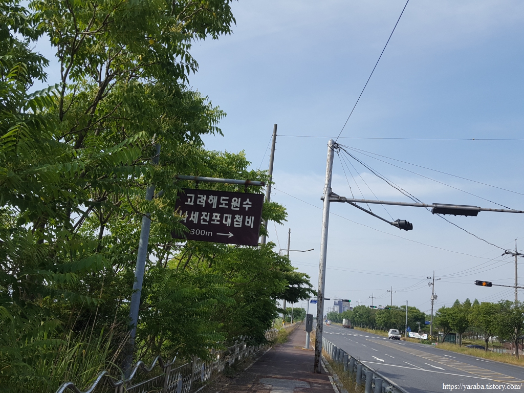 진포해전과 관련한 기념비 표식이 있는데 마치 암호와 같다. 필자의 해석으로 풀어보면 "고려 해도도원수 나세의 진포대첩비"이다. 해도도원수는 왜구의 침략이 있을 때 임금으로부터 군권을 부여받아 해당 지역에서 군사를 징발하고 작전을 총괄하는 직책을 말하는 것으로 고려말 우왕 당시의 진포해전에서는 나세, 심덕부, 최무선이 임명되었으니 나세는 세 장수중의 한 명으로 원나라에서 고려로 귀화하여 조선 초까지 무장으로 삶을 살았던 인물이다.