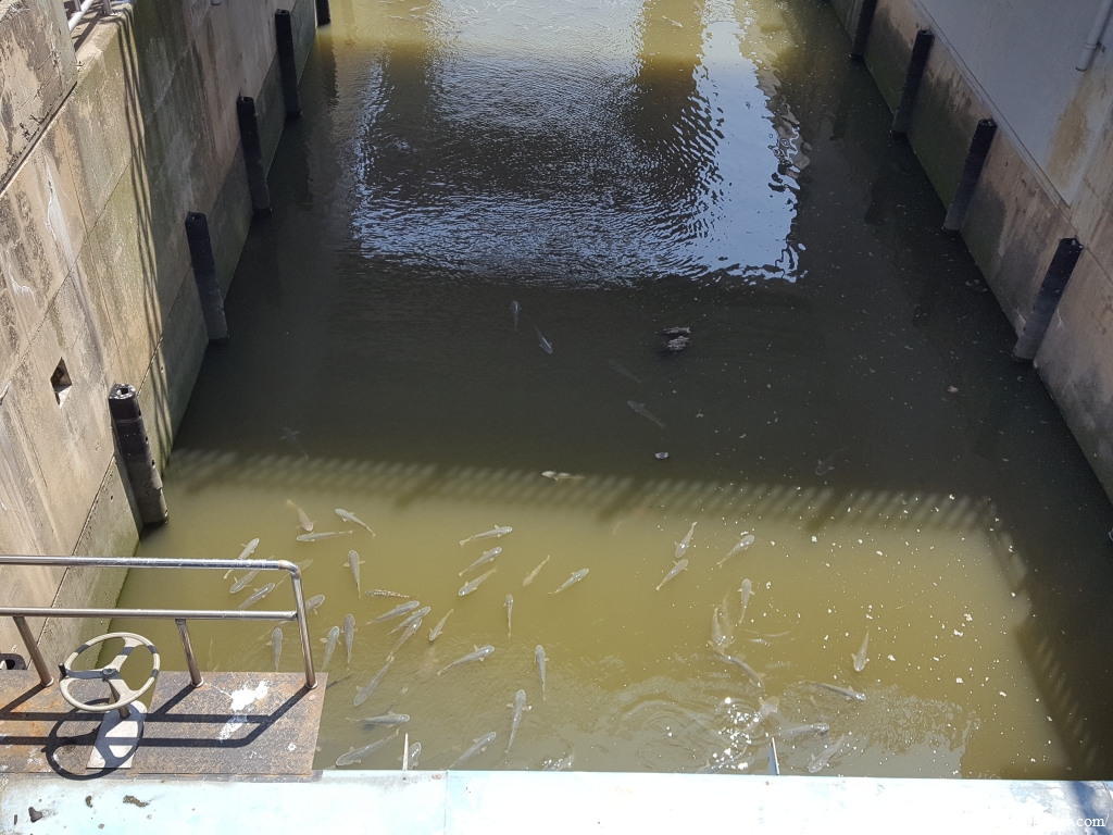 하구둑 어도에는 큼지막한 물고기들이 떼로 몰려있다. 마음은 투망을 던져서 일확천금하듯 고기를 잡고 싶지만 그냥 그림의 떡일 뿐이다.