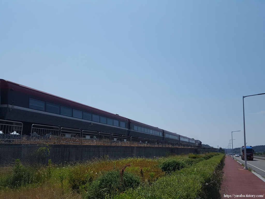 꽃길 옆으로 장항선 새마을호 기차가 기적소리를 울리며 서울로 올라간다.