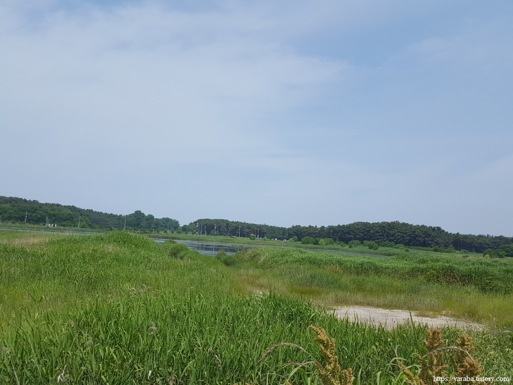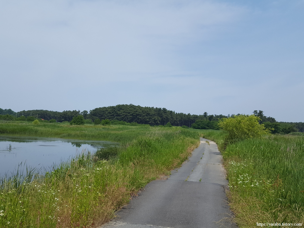 산림욕장으로 가는 길에 만난 작은 습지도 마음의 위로를 건네준다. 도로와 산업단지를 벗어나 녹색 들판과 물을 보는 것만으로도 위로가 된다. "앞들"이라는 이름이 붙어 있다.