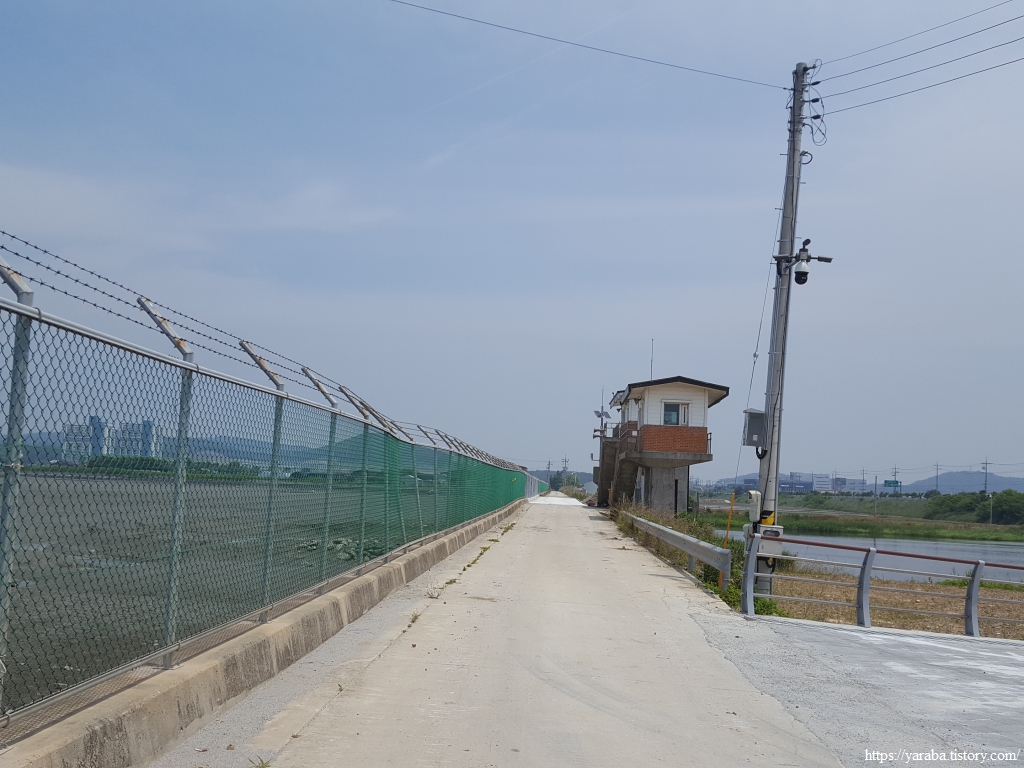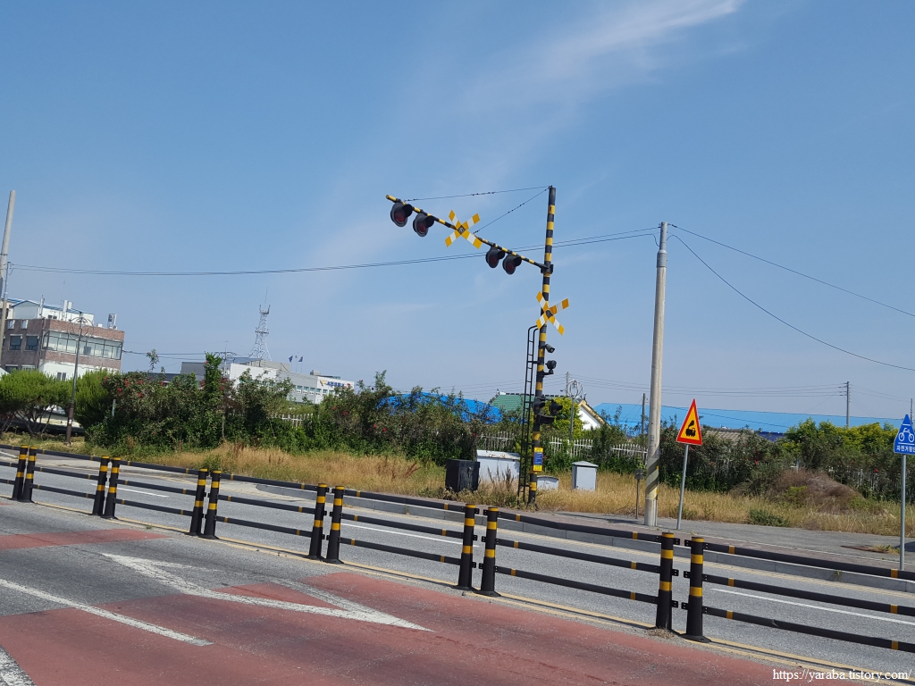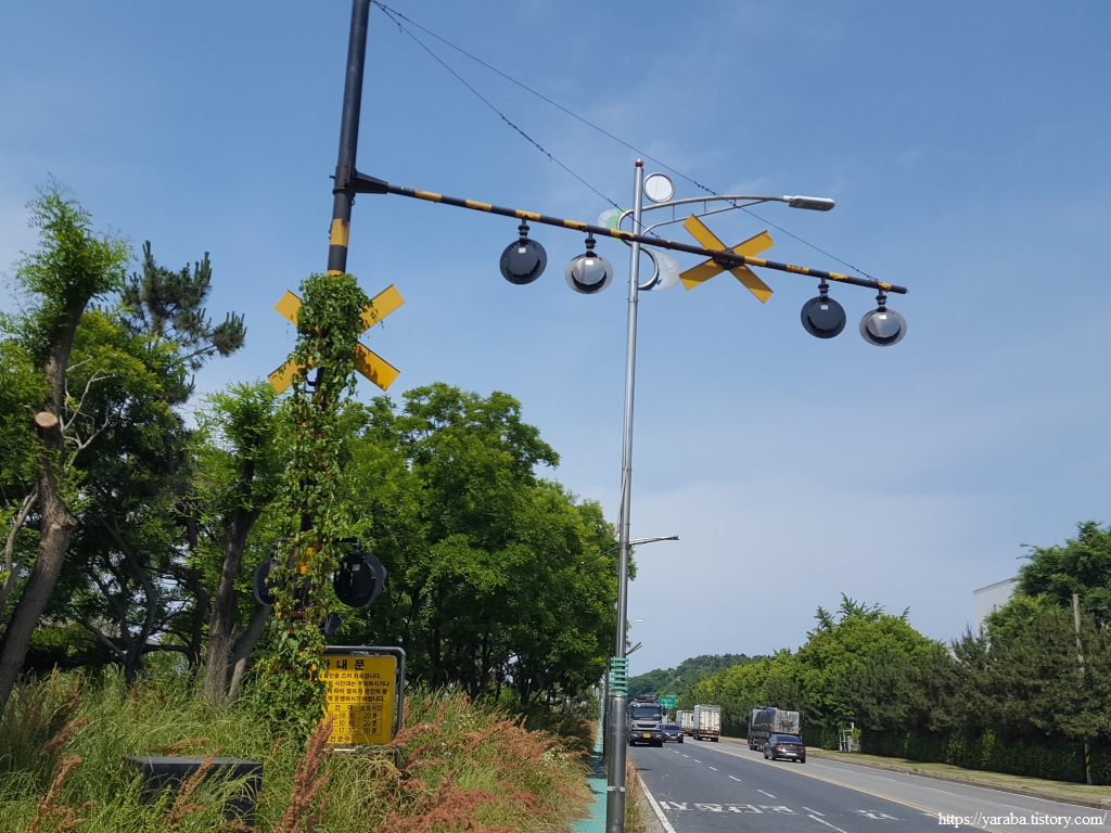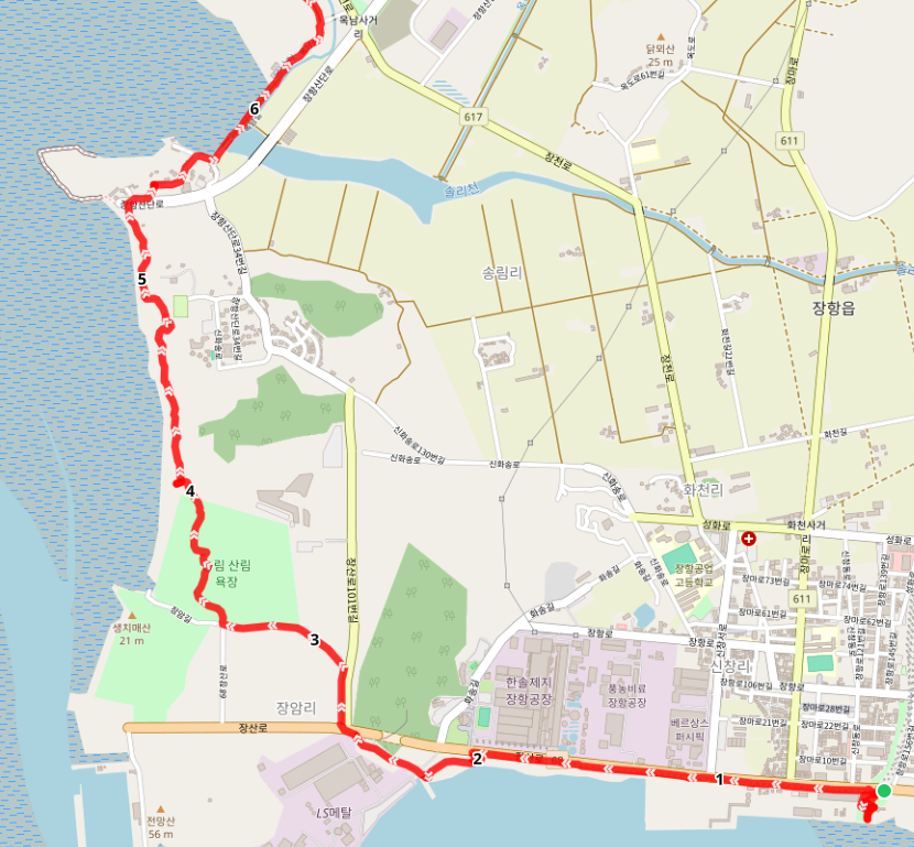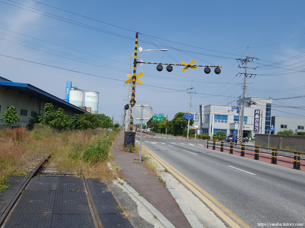 폐선된 장항 화물선 철길과 장항 산업단지 앞의 장산로 대로 함께 서쪽으로 이동한다.