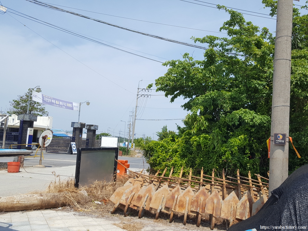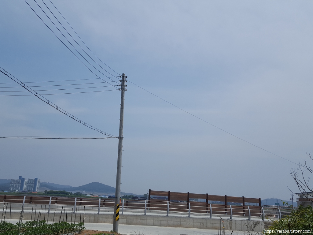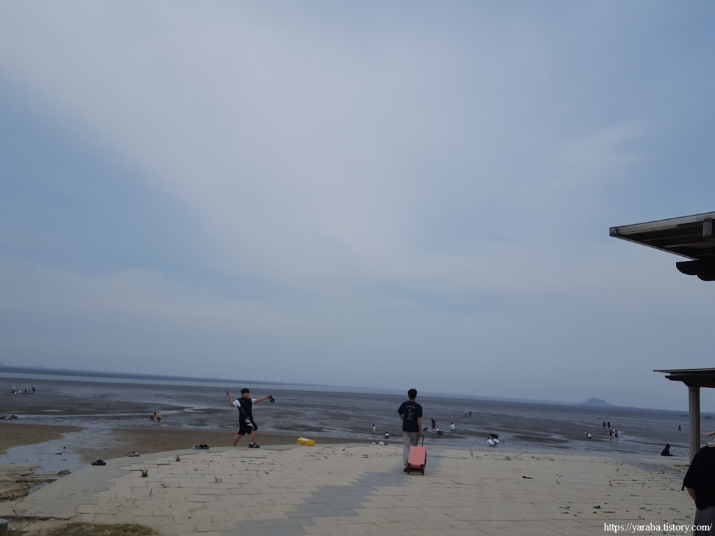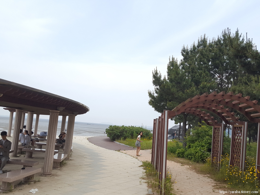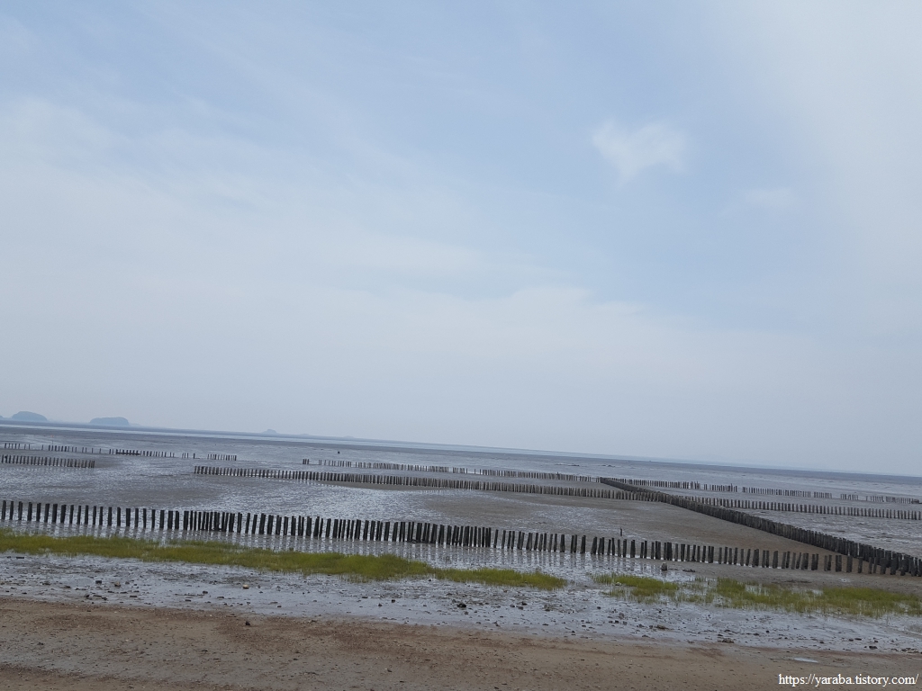 잠시 해변으로 나온 산책로에서 바다를 바라보니 갯벌에 바둑판처럼 울타리를 만들어 놓았다. 아마도 서천송림갯벌체험장에서 체험장 운영을 위해 설치한 것이 아닌가 싶었다. 남도 갯벌에서 어머님들이 갯벌에 자신의 작업 영역을 표시하는 것과 같은 모양새다.