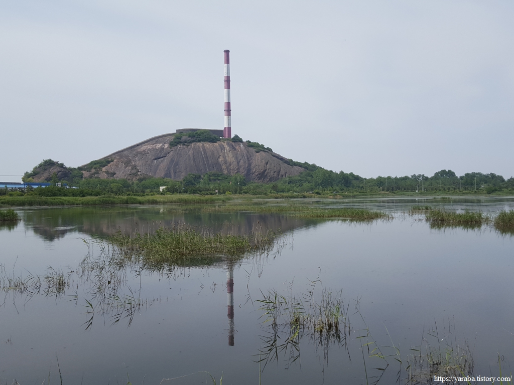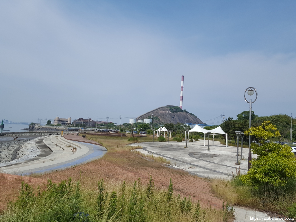 장산로 대로를 따라 걷던 길은 어느덧 산업단지 끝자락에 이르렀다. 멀리 이곳의 랜드마크처럼 우뚝 솟은 바위산 위에 제련소 굴뚝이 인상적이다. 수변 공원을 거쳐서 간다.
