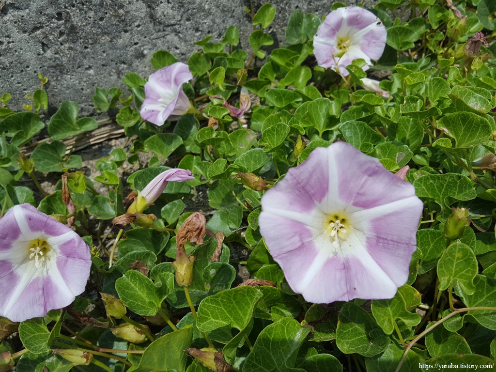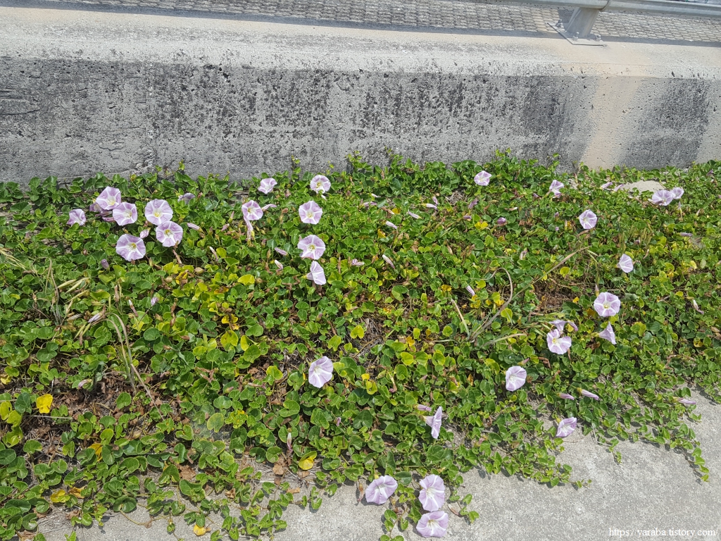 삭막하고 아무런 생명도 자리하지 못할 그런 곳에 갯메꽃들이 나팔꽃 모양의 소박한 꽃을 피웠다. 콘크리트 더미 모서리에 모인 바다 모래에 뿌리내린 생명의 신비가 놀라울 뿐이다.
