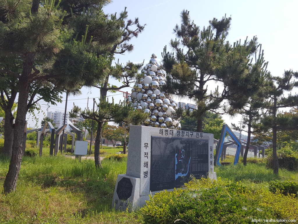 장항 도선장 뒤에는 작은 공원이 마련되어 있었는데 공중화장실도 있고 쉬어 가기 좋았다. 잠시 휴식을 취하고 길을 이어간다. 공원에는 해병대가 한국전쟁 발발 이후 처음 작전을 수행하여 승리를 거두었다는 장항지구 전투 기념비도 있었고 한쪽으로는 장항풍물단 건물도 있었다. 지역의 예술단체가 살아야 지역 문화가 발전 계승될 수 있다는 생각을 해보면 좋아 보인다.