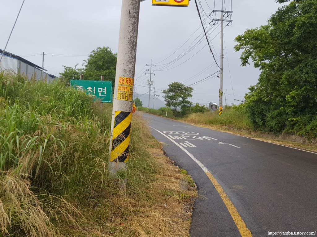 송신로 도로를 따라서 이동하던 길은 해창마을에서 617번 지방도 장천로를 만나서 북쪽으로 이동한다.