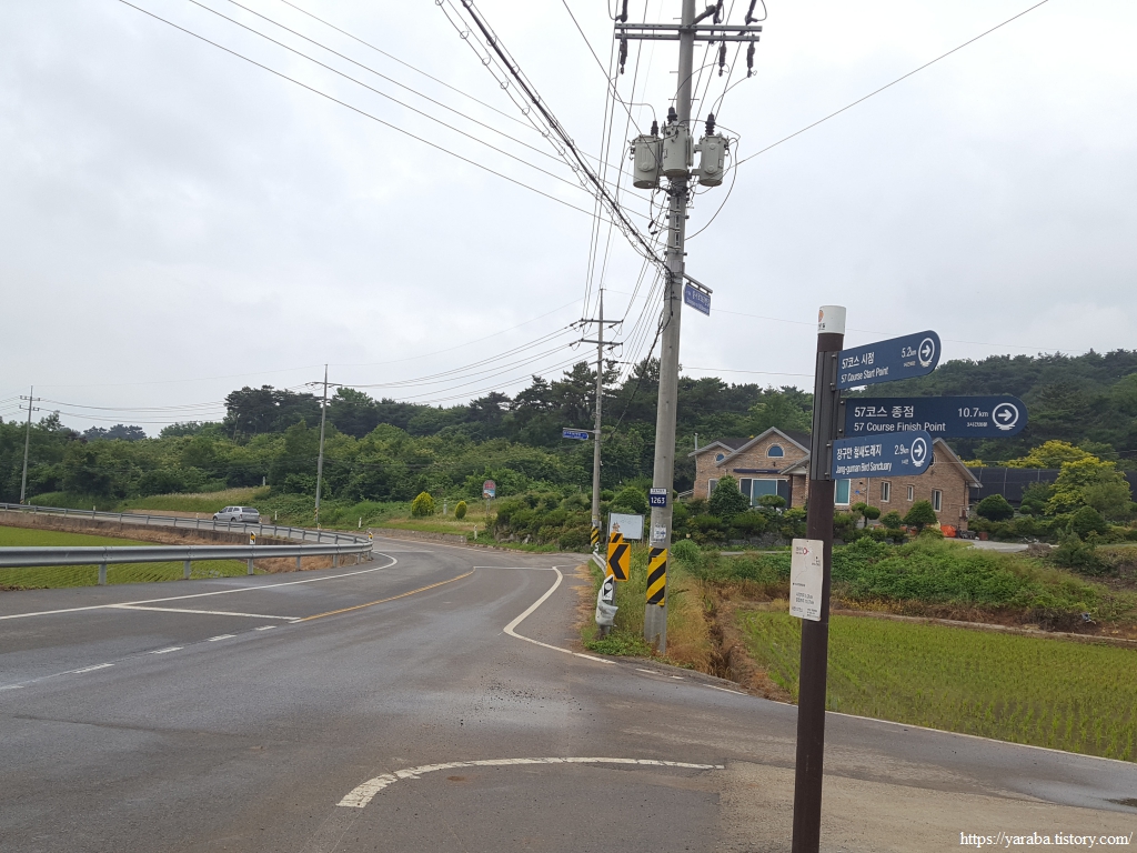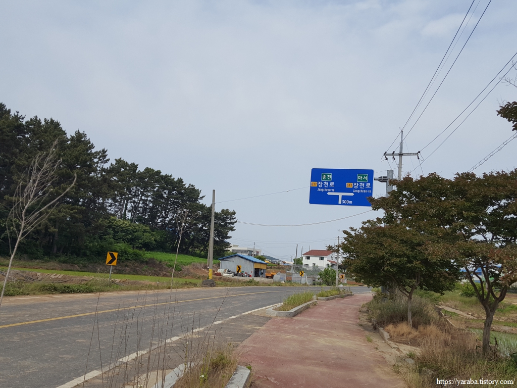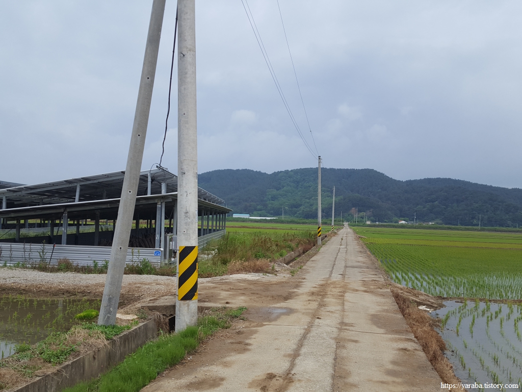 농로를 따라 북쪽으로 쭉 올라온 길은 농로 한가운데 있는 벤치가 인상적이었던 장구 3리 마을을 앞두고 좌회전하여 북서쪽으로 방향을 잡는다. 해창마을에서 만났던 장천로 도로를 가로질러 간다.