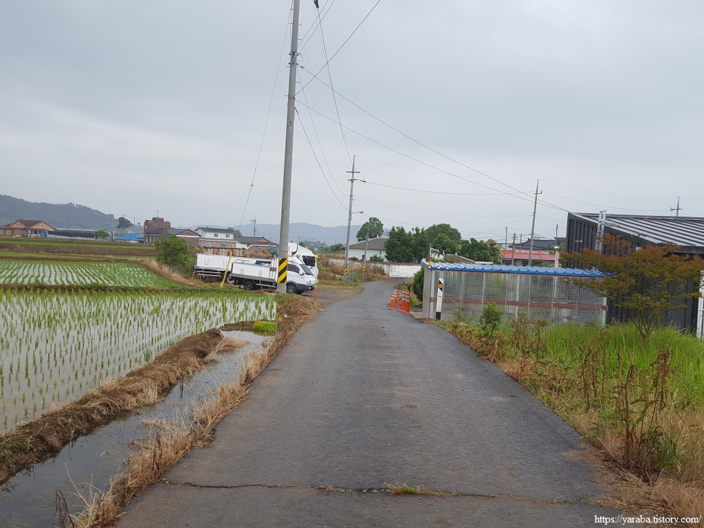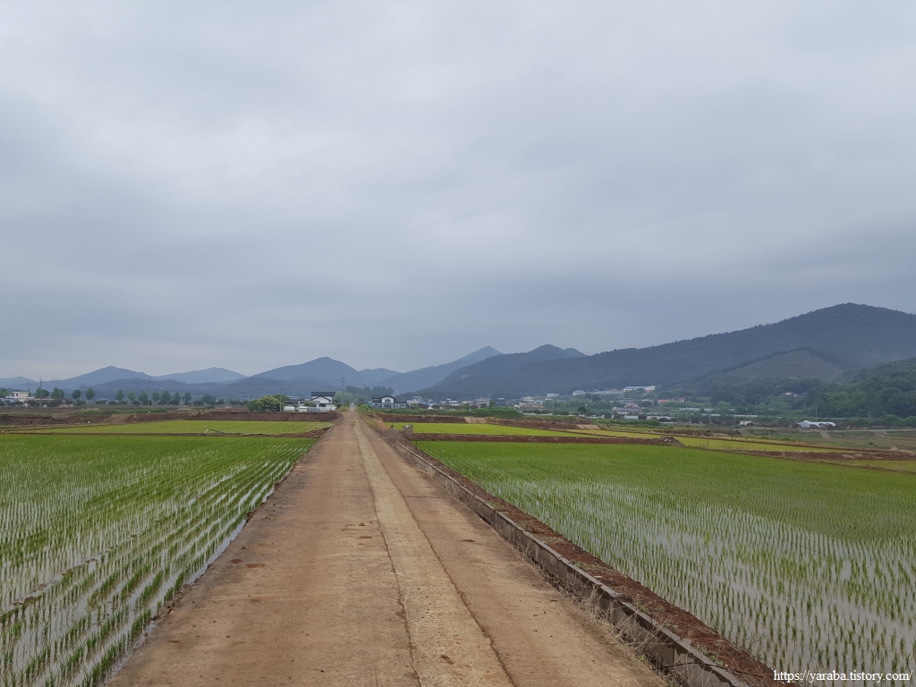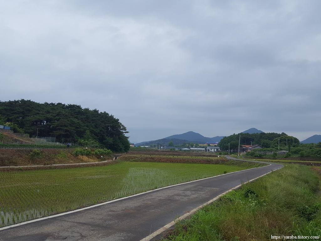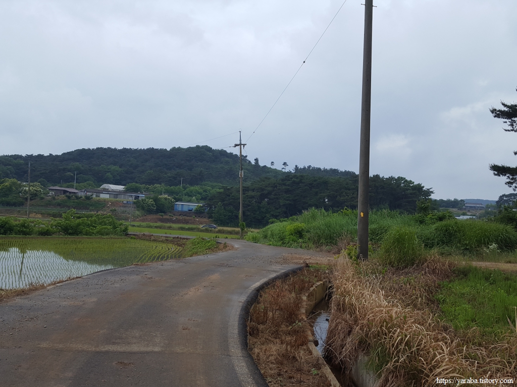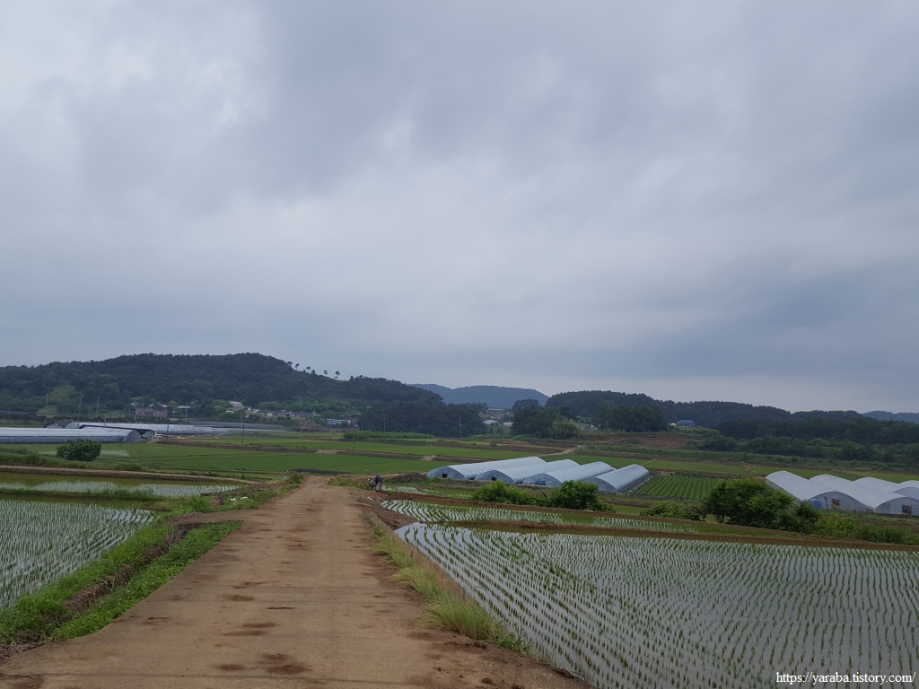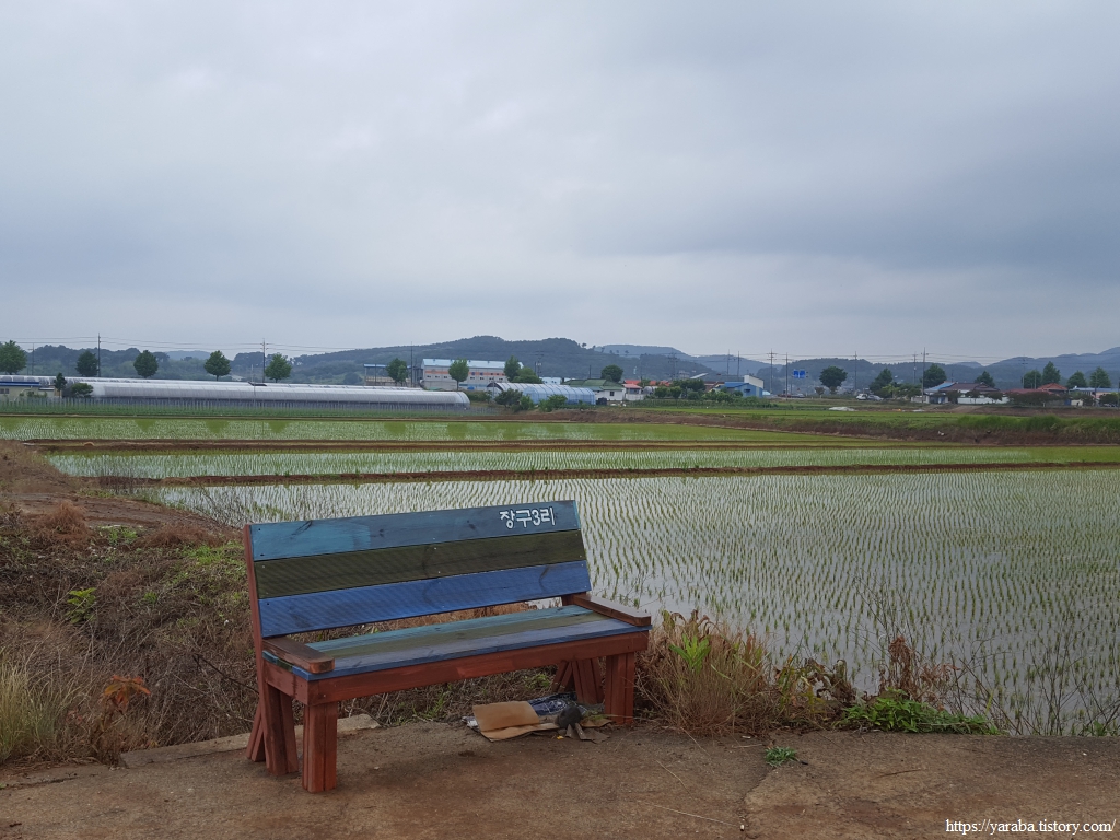 장구마을을 빠져나와 들판을 가로지르는 길, 농로 한가운데에 놓인 작은 벤치가 이채롭다. 북쪽으로 화산을 비롯한 내륙의 산봉우리들을 바라보며 북쪽으로 길을 이어간다.