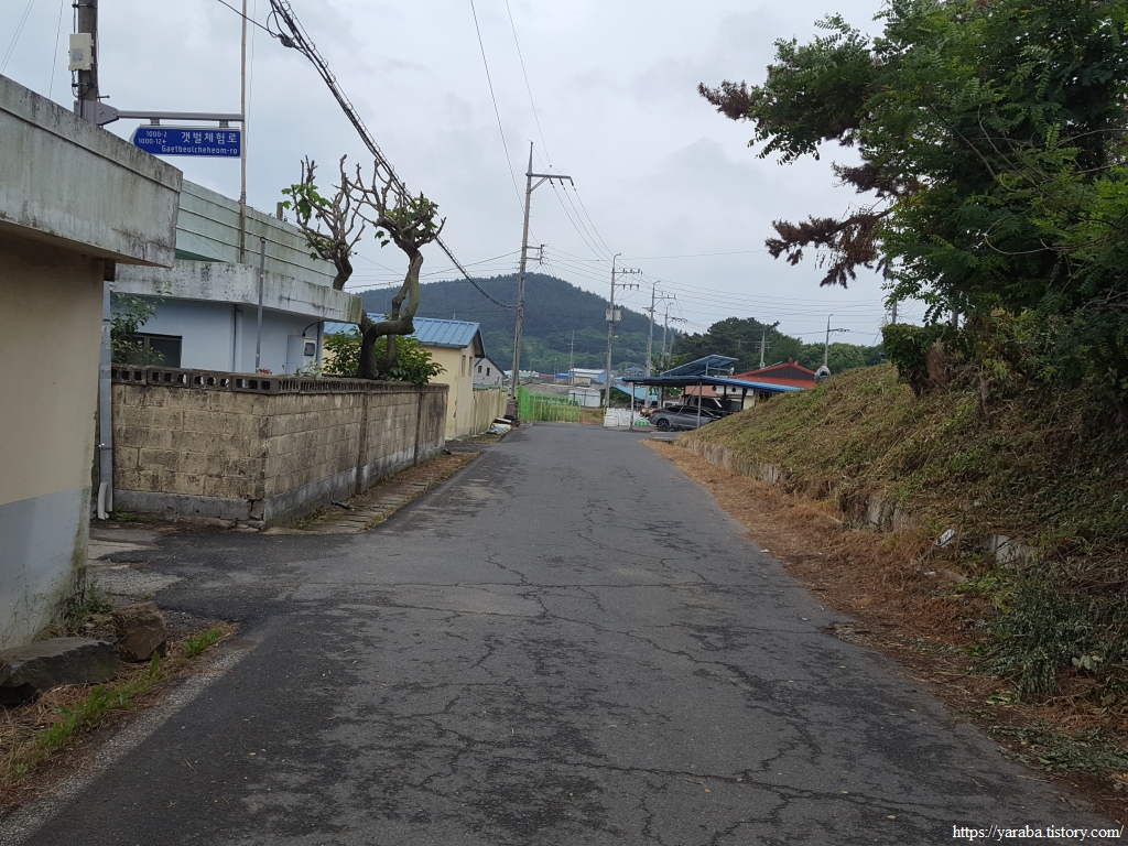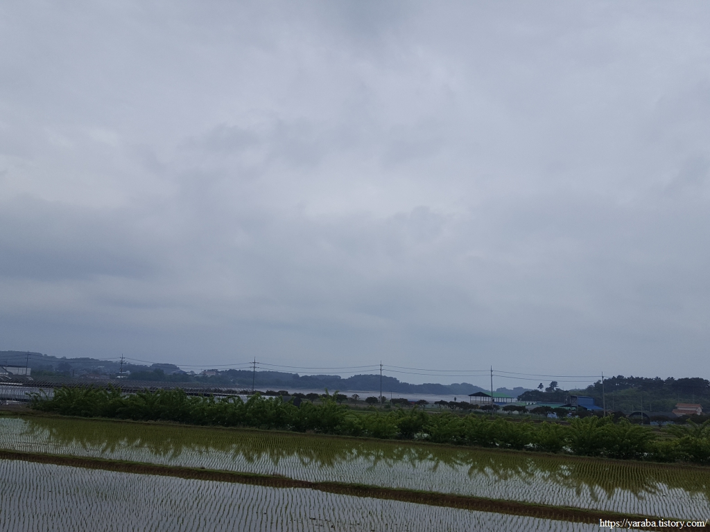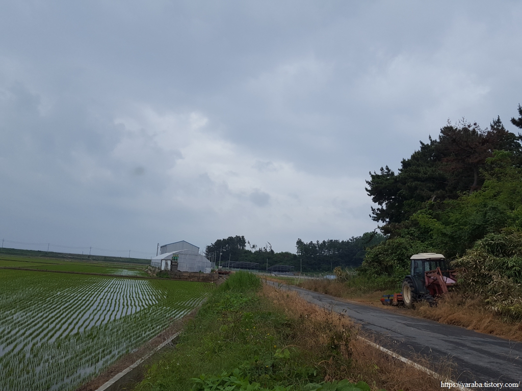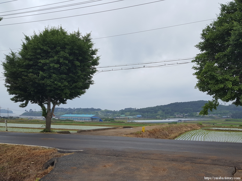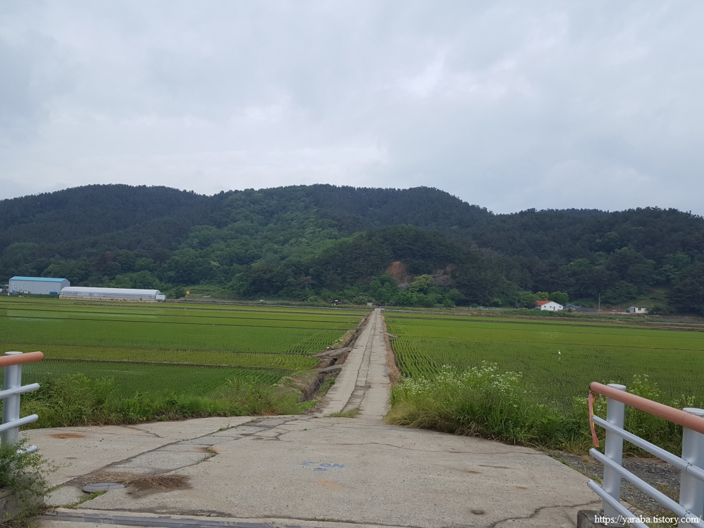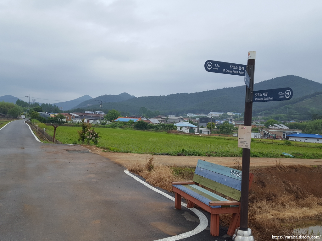 장구마을을 빠져나와 들판을 가로지르는 길, 농로 한가운데에 놓인 작은 벤치가 이채롭다. 북쪽으로 화산을 비롯한 내륙의 산봉우리들을 바라보며 북쪽으로 길을 이어간다.