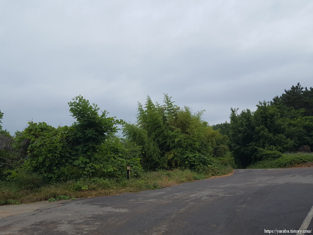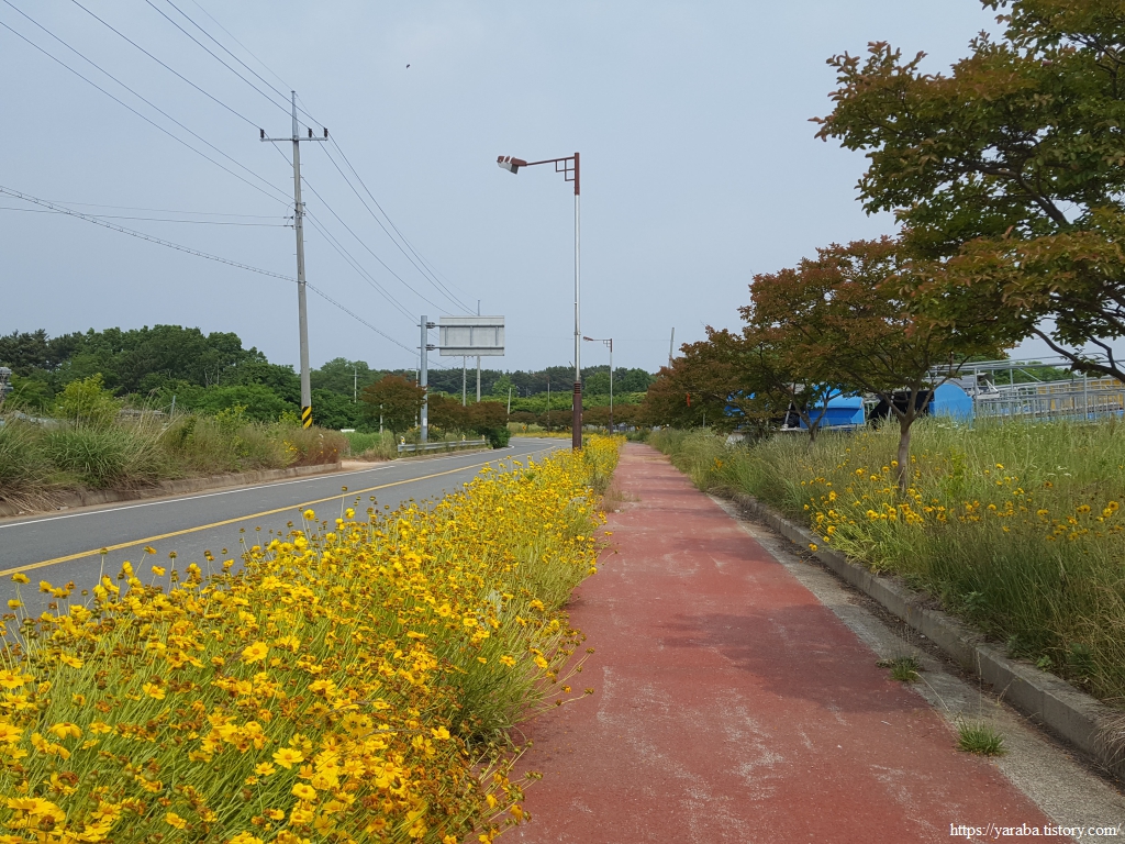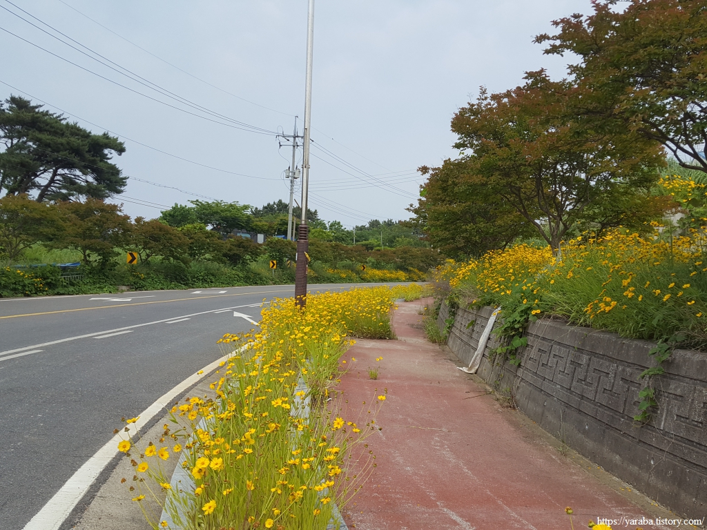 길은 송신로 도로를 따라서 동쪽으로 이동한다. 도로변은 노란 금계국이 과하다 싶을 정도로 길을 점령했다.