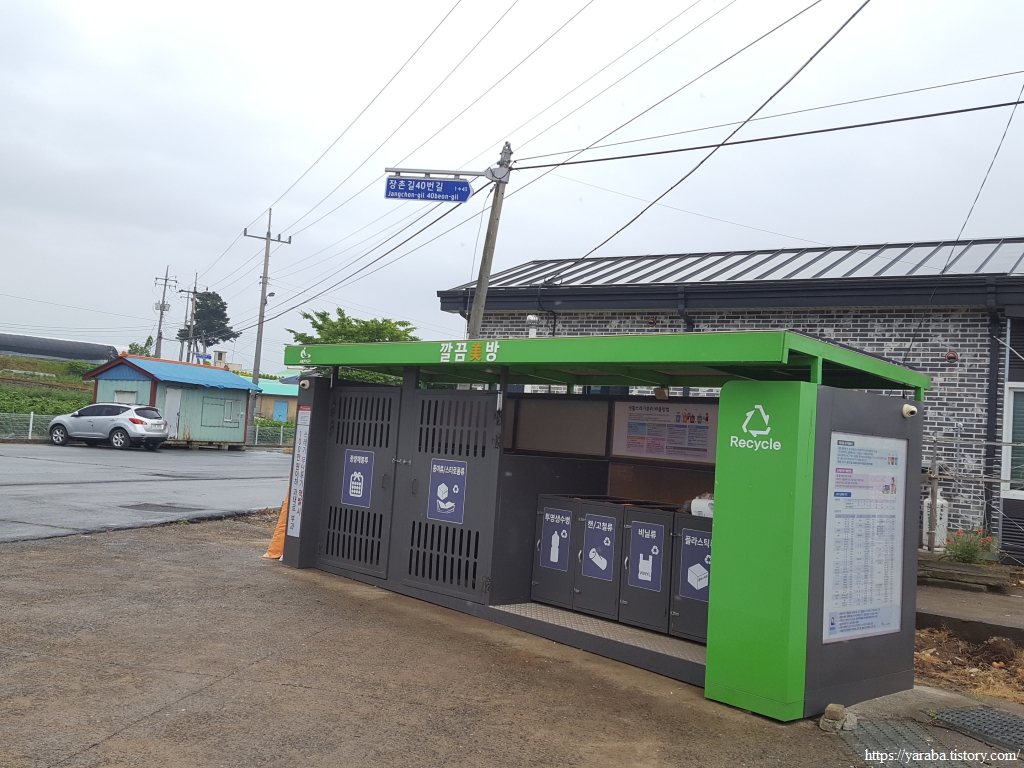 장구 2리 마을회관을 지나는데 재활용품 수집부스가 인상적이다. "깔끔미방" 이라는 이름처럼 깨끗하고 CCTV까지 설치한 첨단 시설도 구비했다. 서처군내에 설치를 지속적으로 늘리고 있는 모양이다.