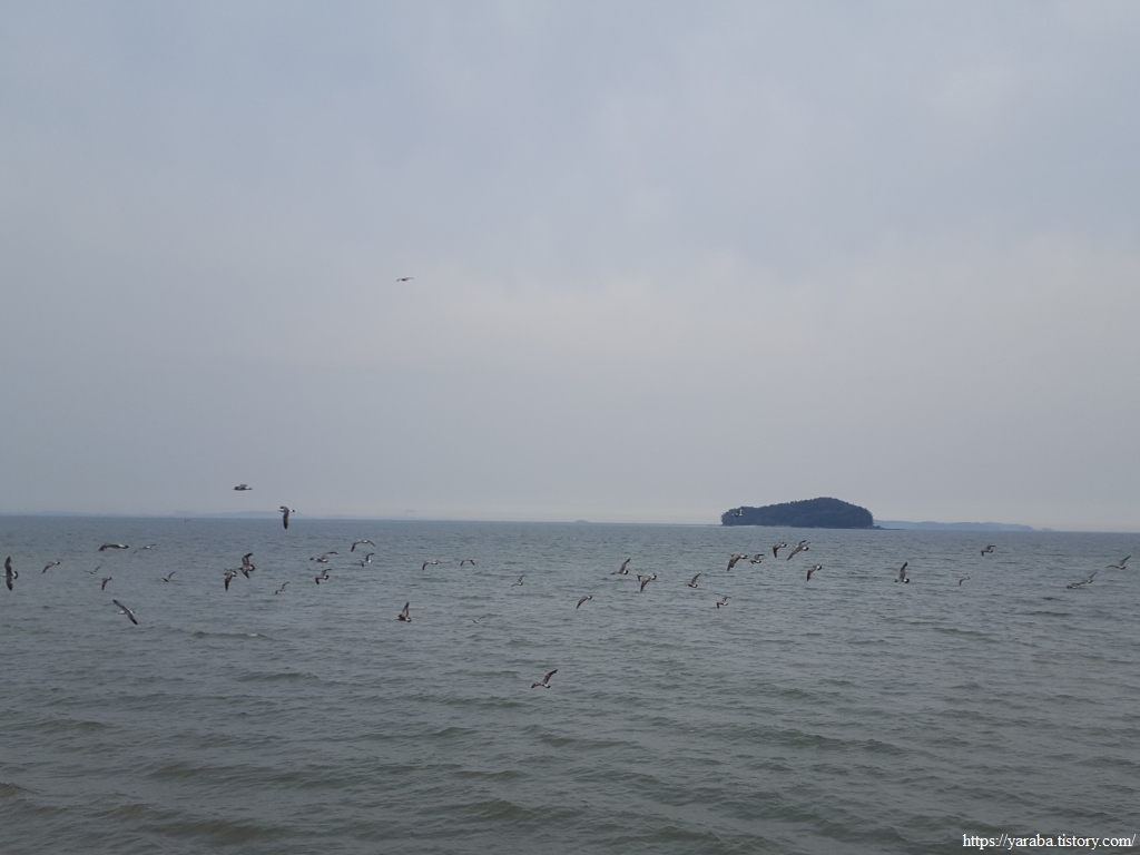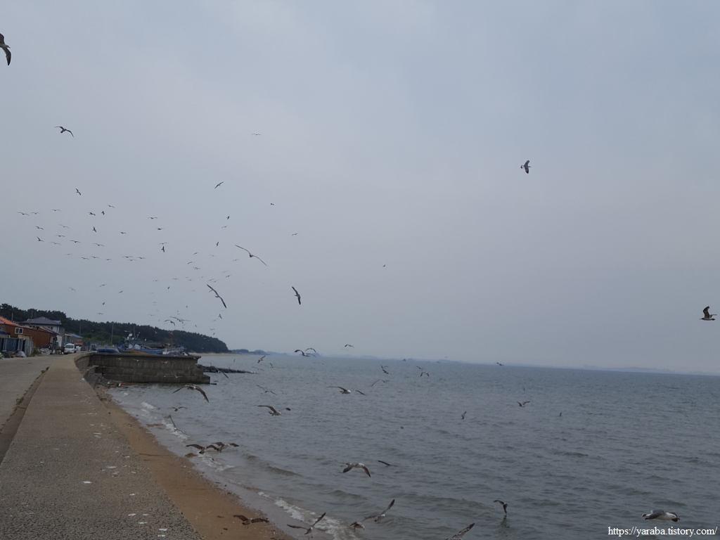 나그네를 반기는 것인지, 아니면 경계하는 것인지 모르겠지만 해안에서 쉬고 있던 갈매기들이 일제히 날아올라 군무를 이룬다.