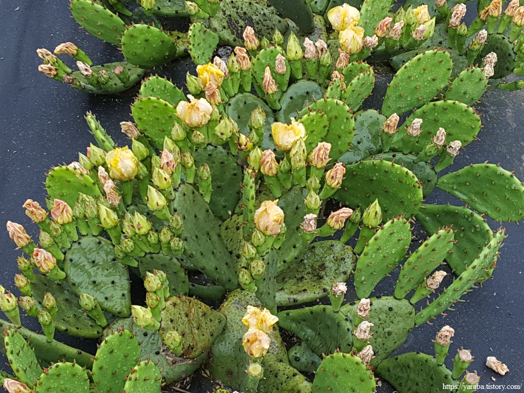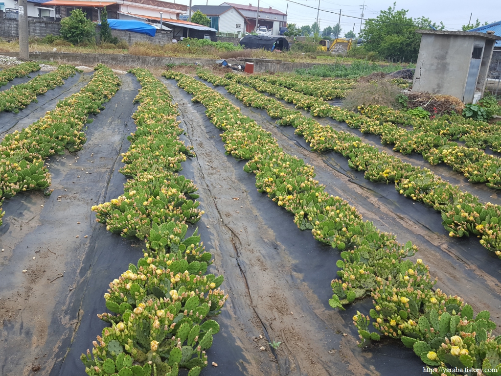 제주도나 기타 지역에서 손바닥 선인장(백년초) 키우는 곳을 본 적이 있기는 하지만 멀칭 하여 이렇게 깔끔하게 재배하는 곳은 처음이다. 약용도 하고 식용도 하는 식물이니 실제 용도는 모를 일이다. 하긴 필자는 비슷하지만 다른 백년초와 천년초의 구분도 할 수 없다.