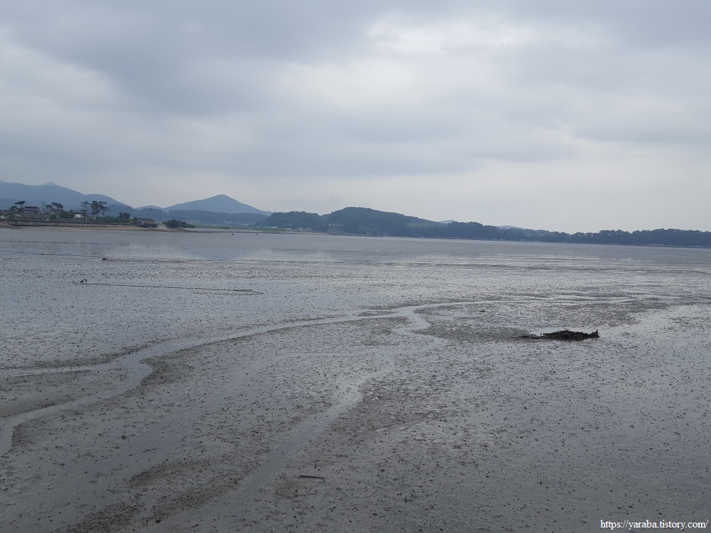 물이 빠지고 있는 중인지, 아니면 들어오는 중인지 모르겠으나 물이 자박자박 있는 갯벌이 보기 좋다. 물이 싹 빠져 버린 갯벌은 너무나 투박하고, 물이 들어오면 갯벌인지 바다인지 분간이 어렵고 물이 자박자박 있는 이런 상태의 갯벌이 딱 좋아 보인다. 벌교 갯벌에서 만났던 뻘배를 얹어 놓아도 잘 미끄러져 나갈 것 같다. 빛깔 좋은 갯벌을 바라보며 다사항으로 이동한다.
