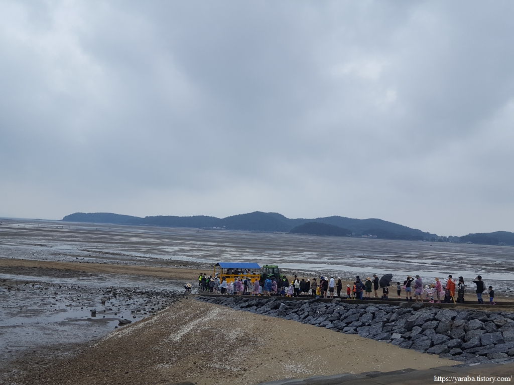 바다에서는 트랙터 수레가 사람들을 나르고 있는 선도리 갯벌 체험 마을에서 긴 여정을 마무리한다.