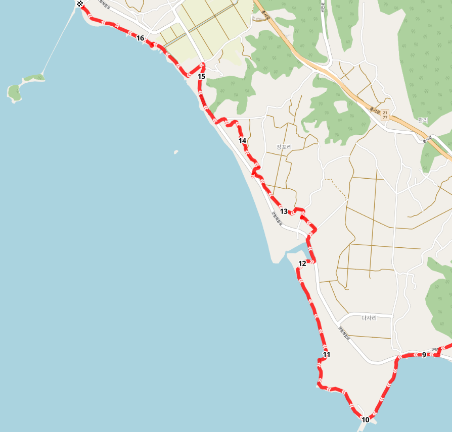 갯벌체험로는 직진하여 장포리로 향하고 우회전하여 21번 국도 쪽으로 향하는 길도 있지만 길은 다사항으로 향한다. 다사리는 한자로만 보면 모래가 많은 마을이라는 의미이다.
