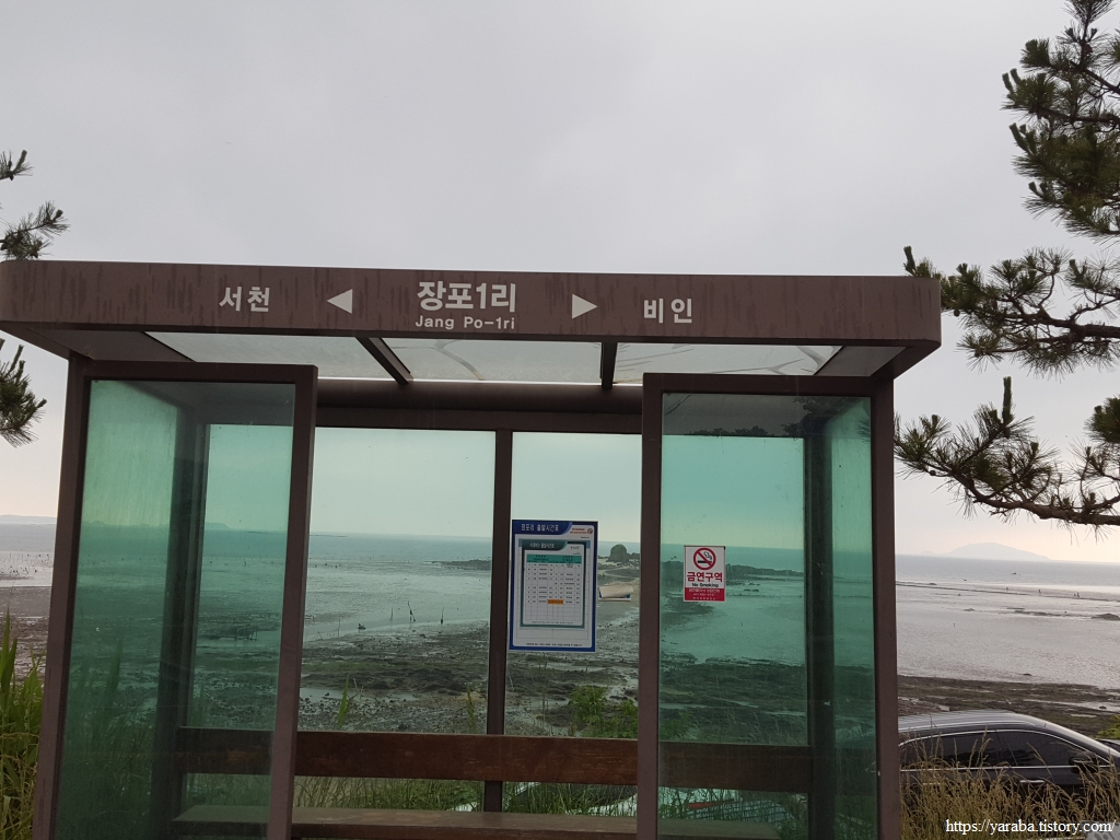 마을길을 걸어온 길은 장포 1리 정류장에서 다시 갯벌체험로로 올라와서 도로를 따라 이동한다. 버스 정류장에서 잠시 쉬었다가 길을 이어간다. 앞바다의 작은 섬은 할미섬이라는 이름이 붙어있다. 이곳에서 잠잠했던 비가 갑자기 세차게 쏟아진다. 인근 도로에는 조개를 캐러 온 사람들이 쏟아지는 비에도 불구하고 씩씩하게 바다로 나간다.
