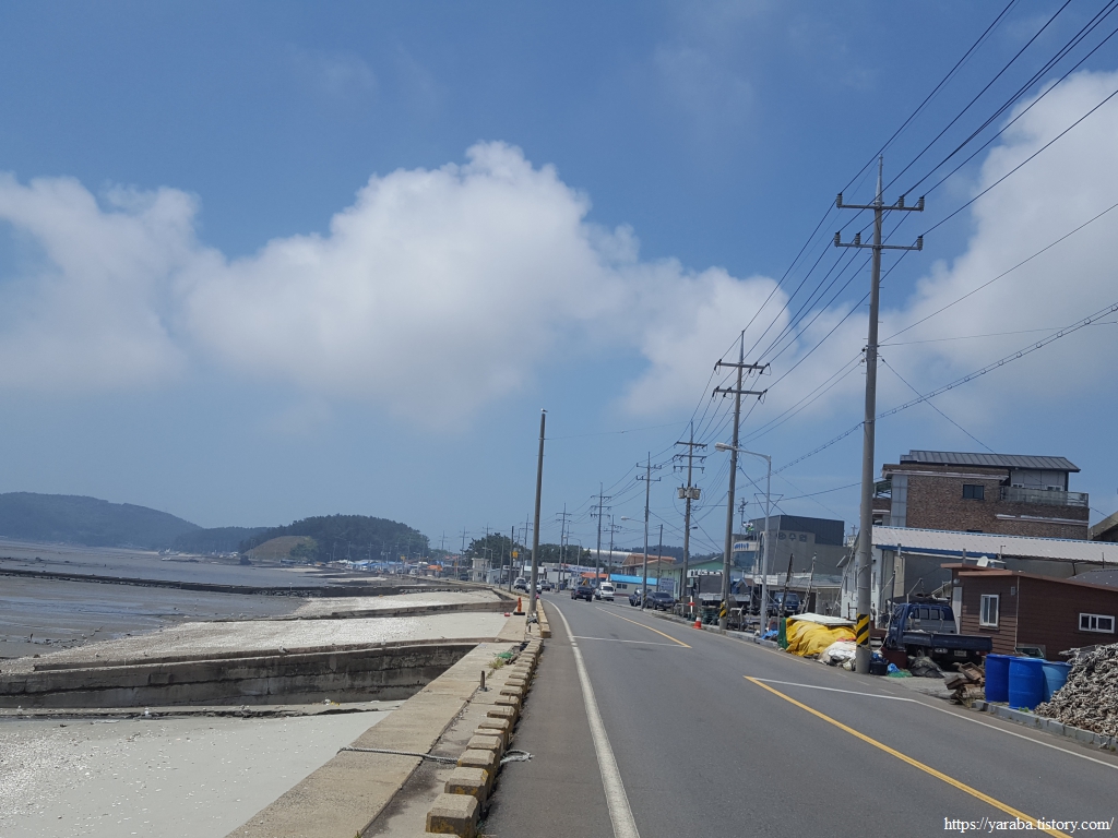 길은 해안선 끝자락에서 해안도로와 합류하는 부분에서 갓길로 올라선다. 이른 아침부터 오락가락 빗줄기를 내리던 하늘도 거짓말처럼 쾌청한 하늘로 바뀌었다. 정면으로는 서천 화력발전소의 긴 굴뚝이 발전소의 존재를 알려준다.