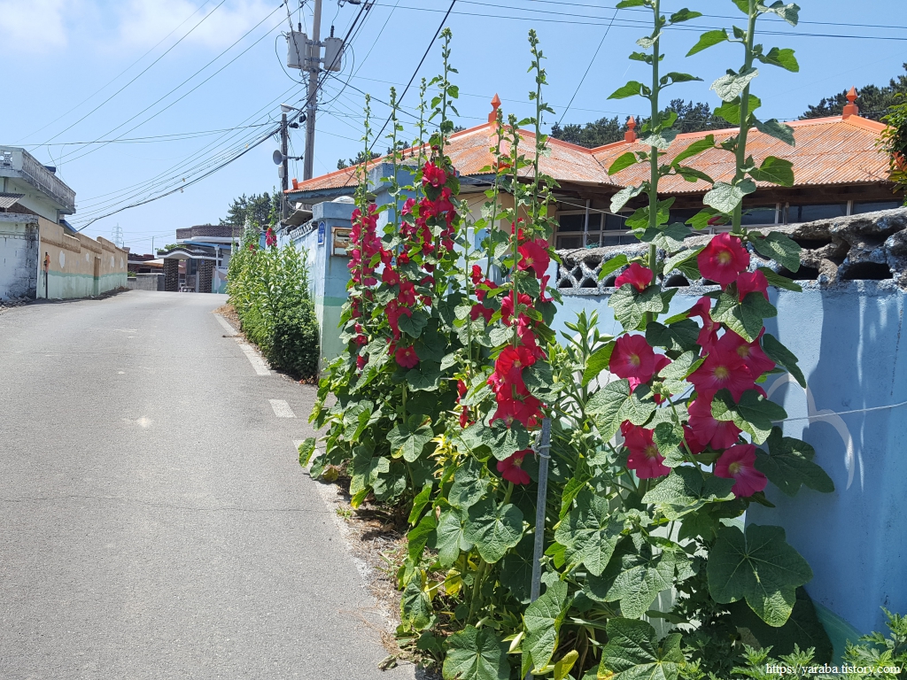 담벼락 작은 화단에 심은 접시꽃이 화려한 꽃을 피웠다. 접시꽃이 피었다는 이야기는 이제 여름이라는 소리이기도 하다.