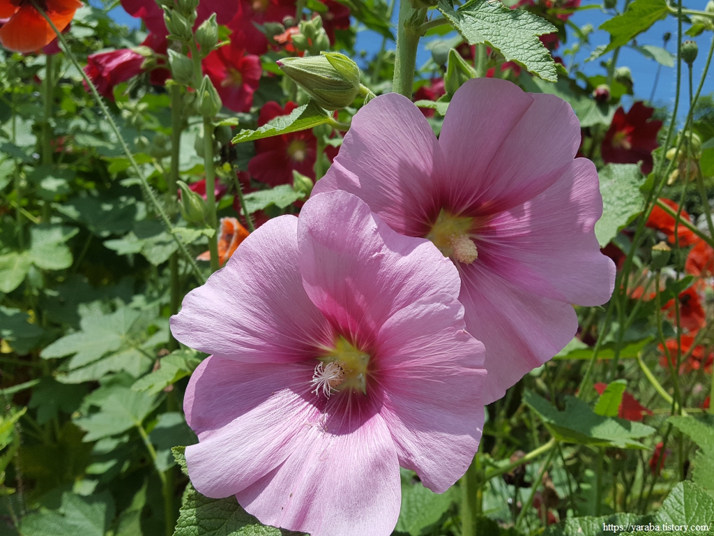 길은 놀녹산 아랫자락의 작은 언덕길을 넘어간다. 갖가지 색을 가진 접시꽃이 화사하다.