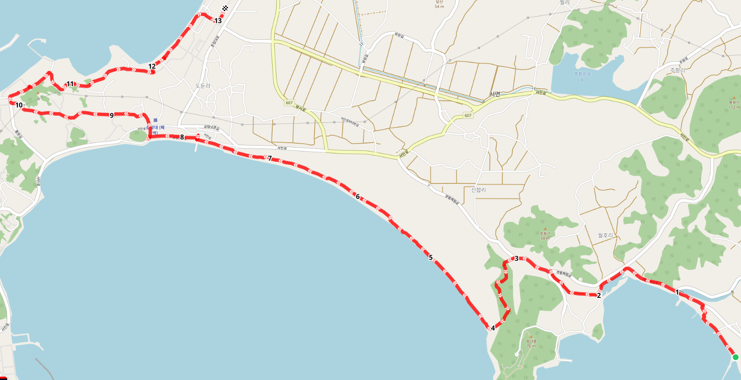 길은 해안도로를 따라 서도초등학교 앞을 지나며 해안 끝자락으로 이동한다. 해안도로 끝자락에 찐만두를 파는 가게가 있었는데 휴식을 취하면서 늦은 점심도 해결할 수 있었다.