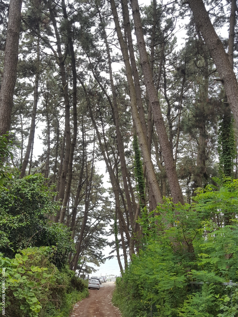 울창한 나무 숲 터널 끝에는 바다를 즐기러 나온 사람들이 자동차들을 나란히 주차해 놓았다. 비밀의 세계로 들어가는 입구처럼 보인다.