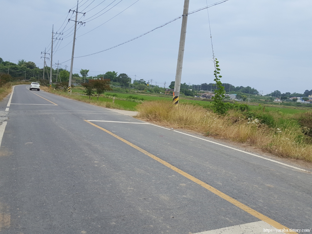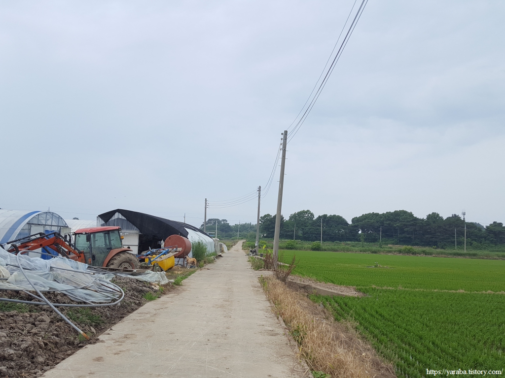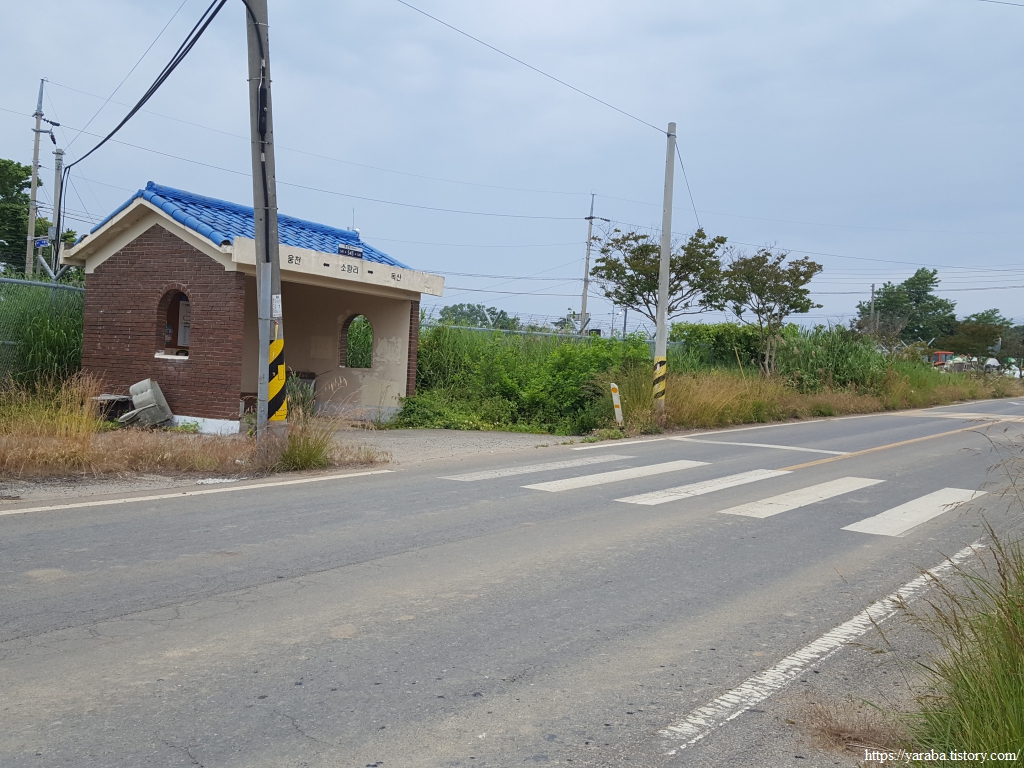 좁은 도로 갓길을 피해서 농로를 돌아온 길은 소황마을 정류장에서 다시 독산로 도로를 만나 도로변을 걷는다.