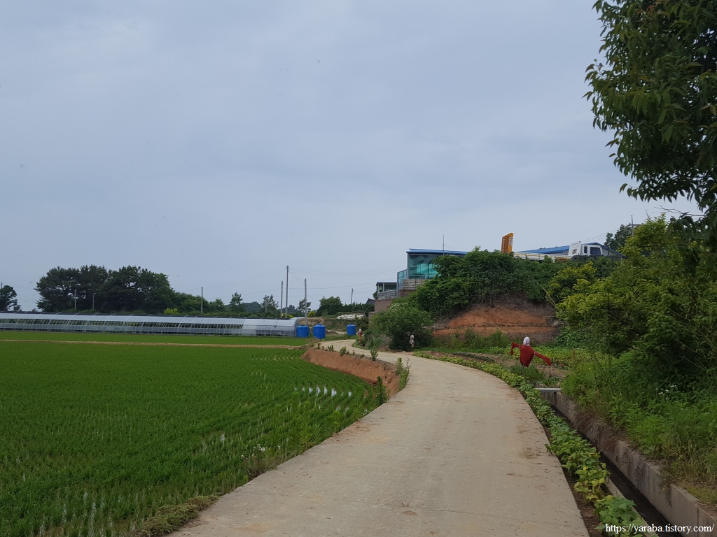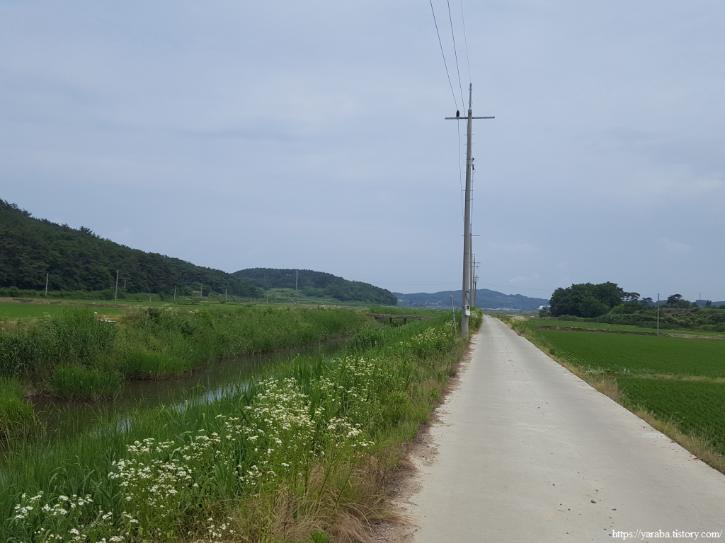일주일 전만 해도 막 모내기를 끝낸 상황이었는데 이제 들판은 잔디밭처럼 녹색 옷으로 갈아입었다. 중간에 갈림길을 만나지만 계속 직진한다.