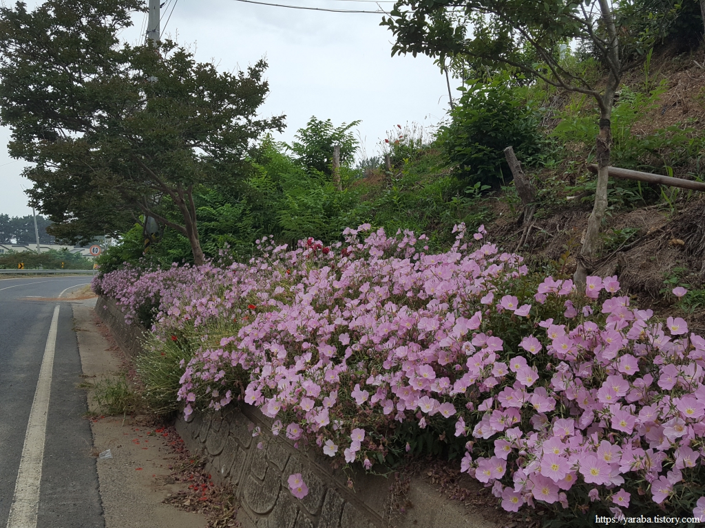 도로변 갓길을 걷다가 길 건너 화사한 꽃밭을 보니 그냥 지나칠 수 없다. 분홍 낮달맞이꽃을 사진에 담고 길을 이어간다.