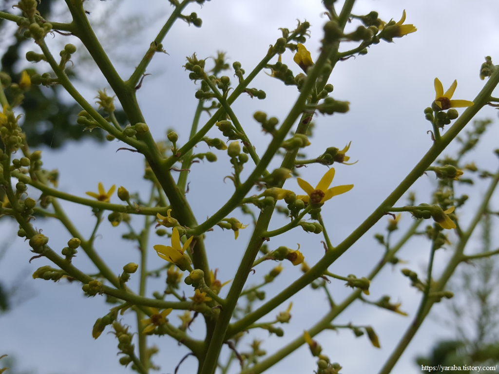 이곳 열린바다로 도로의 가로수도 특이하다. 열매를 가지고 염주를 만든다는 모감주나무이다. 개나리 같은 노란 꽃이 여름을 부른다.
