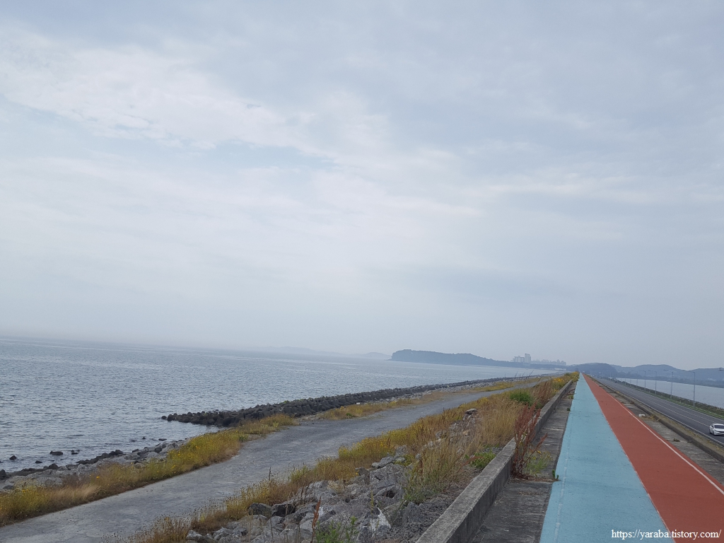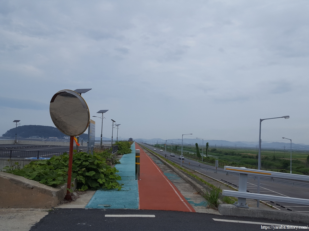 남포 방조제 끝에 도착했다. 1985년에 공사를 시작하여 1997년에 완공했으니 10년이 넘는 세월에 걸쳐 만든 방조제이다. 방조제 위의 길은 깔끔하게 잘 정비되어 있었지만 내려가는 길은 따로 없어서 가파른 길을 조심스레 내려가야 했다. 조금은 당황스러운 순간이었다.