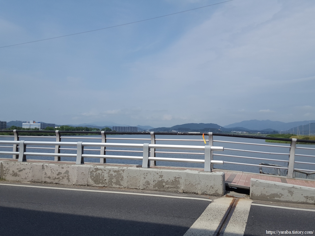 남포 방조제 북쪽 끝자락에서 바라본 그림은 좌측에는 군보유 복지시설 앞의 모래 해변이고 우측은 남포천이다. 수많은 세월 동안 내륙의 흙을 퍼 날라서 방조제 안쪽에 광대한 평야를 만든 하천은 이제 방조제에 길이 막혀 호수가 되었다.