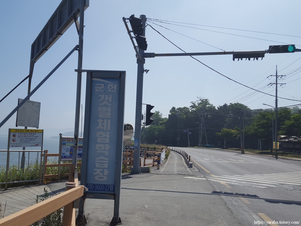 중간에 보령 군헌 갯벌체험장을 만나서 잠시 쉬어간다. 해안로 길건너에 체험장의 쉼터가 있었는데 넉넉한 휴식을 취하기에 좋았다. 해안길을 걸으면 휴식 장소를 만나기 어려운데, 참으로 반가운 장소였다.