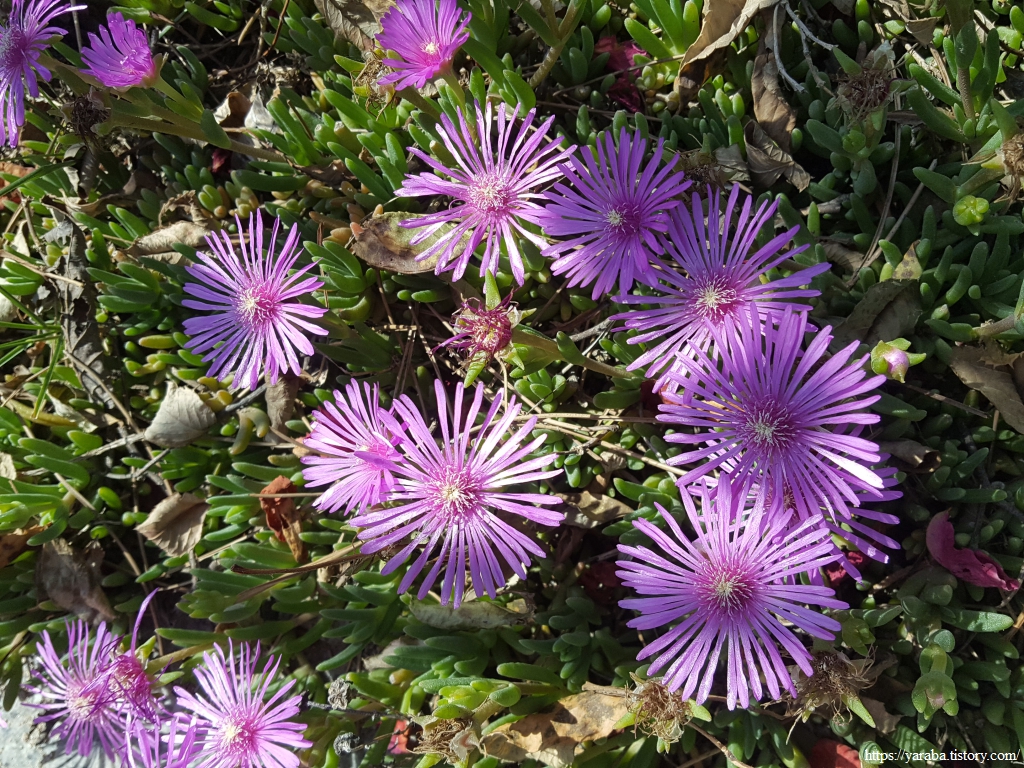 장미 터널 아래에는 보랏빛의 송엽국이 아침 햇살을 받아서 더욱 찬란한 빛을 뽐낸다.