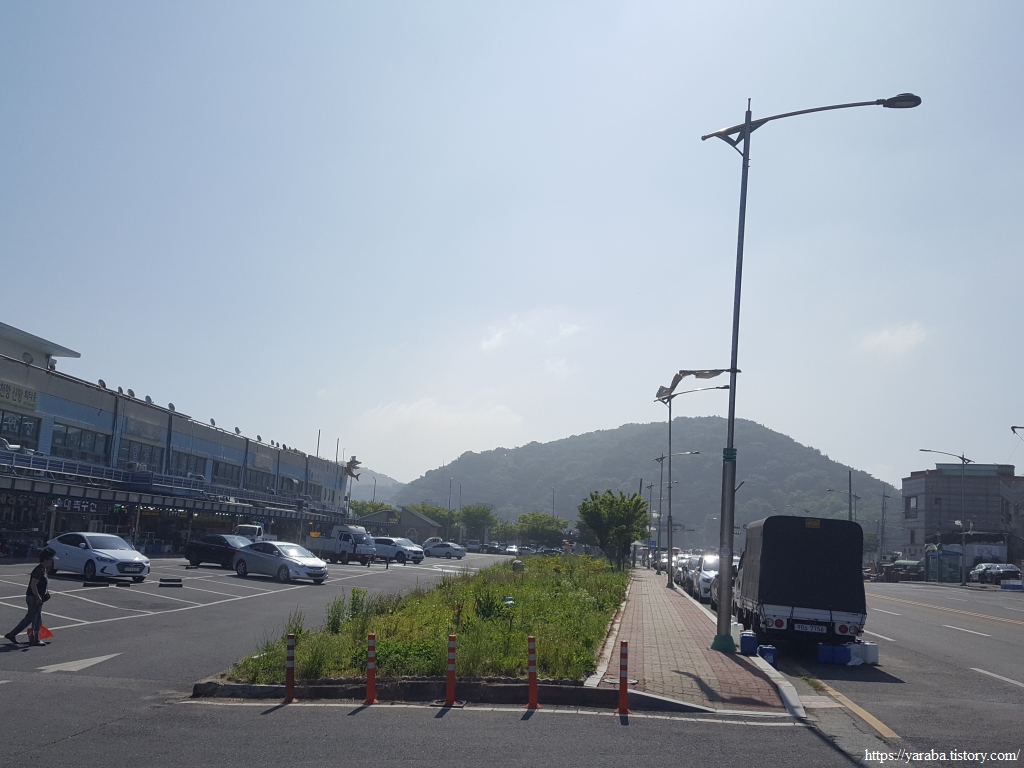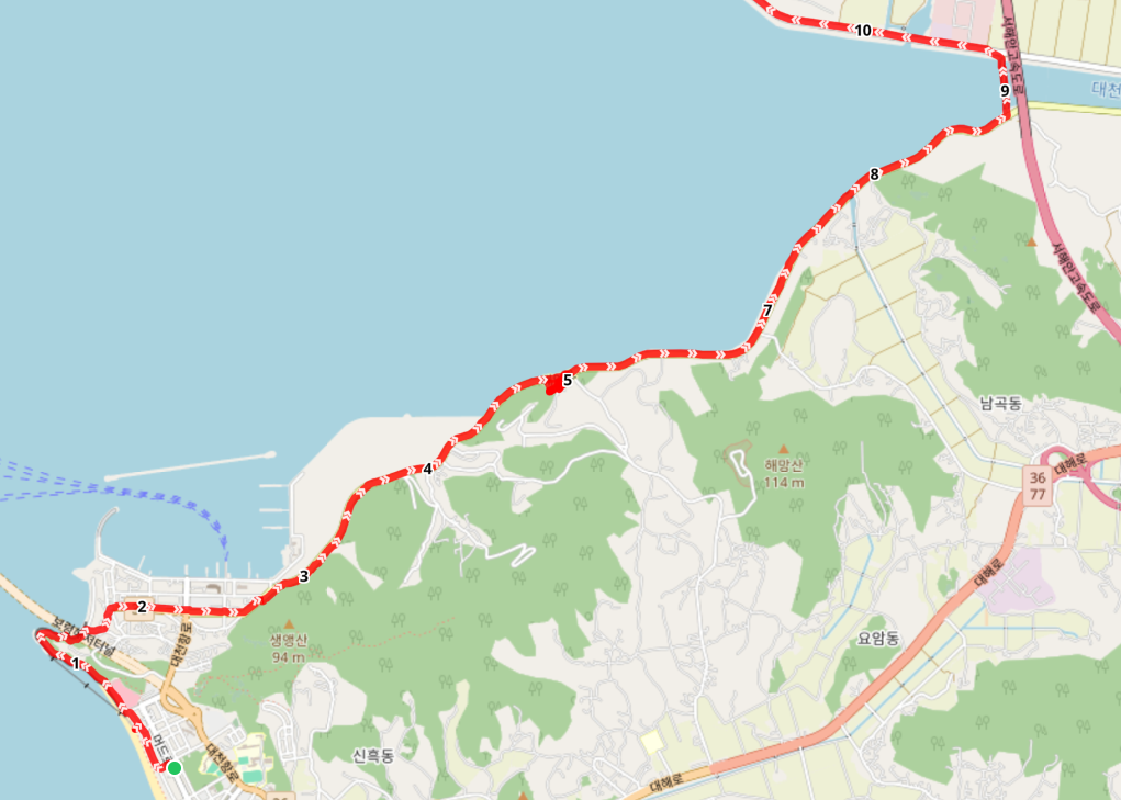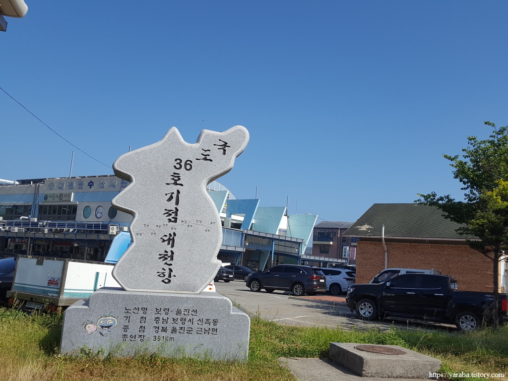 길이 대천항 안으로 들어가지는 않고 외곽으로 지나쳐 간다. 밖으로는 수산물 시장이 있고 안쪽으로는 보령의 삽시도, 장고도, 외연도와 같은 섬들로 가는 배를 탈 수 있는 여객선 터미널이 있다. 국도 36호선 기점이라는 표식이 있는데 한반도 중앙을 가로지르는 국도로 대천항에서 출발하여 동해안의 울진읍까지 이어진다고 한다. 해파랑길 26코스가 시작되는 양정항이 있는 곳이다. 2년 6개월 전에는 동해안을 거슬러 올라가고 있었는데 지금은 서해안을 거슬러 올라가고 있다. 아직 갈길이 멀다.