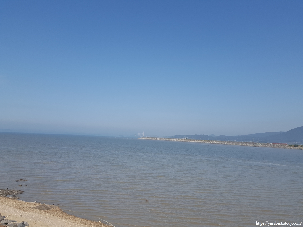 대천천을 건너기 직전에 바라본 바다 건너 북쪽의 모습에는 보령 화력 발전소의 거대한 굴뚝이 마치 등대처럼 서있다.