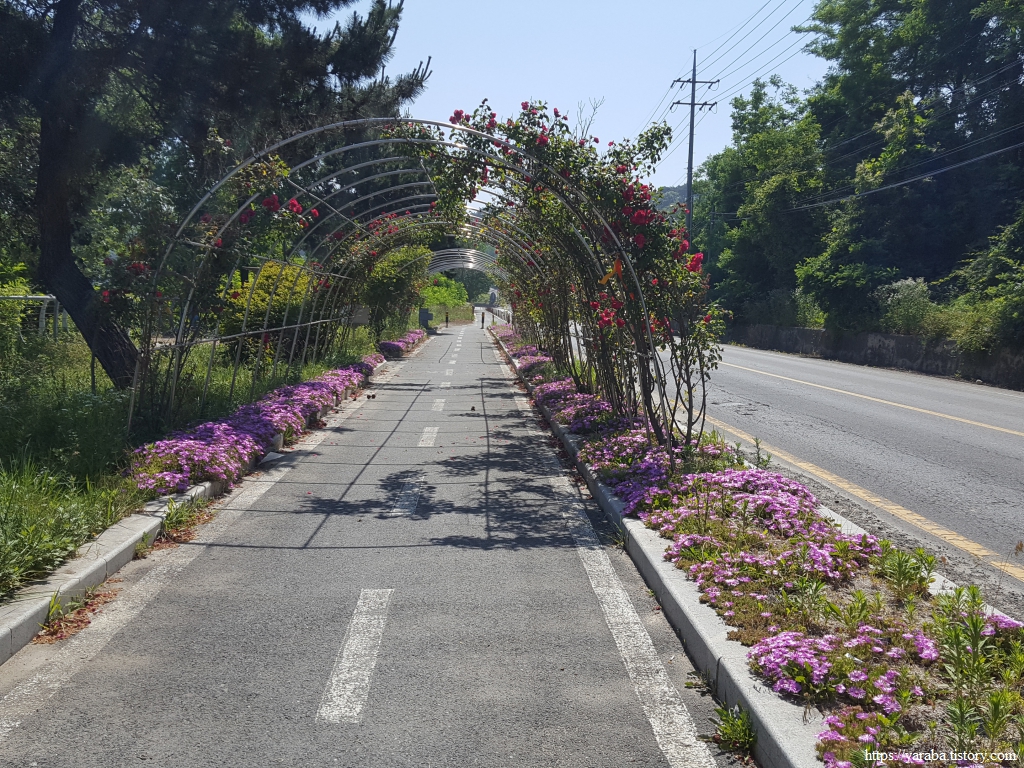 밤골마을 앞으로 지나는 길에는 온갖 음식점과 카페들이 이어지며 군침을 돌게 한다. 군헌 마을에서 휴식을 취하며 요기를 하지 않았다면 이곳의 식당 중 하나에 쑥 들어갔을지도 모르겠다. 장미 터널로 위로하며 길을 이어간다. 길은 보령시 신흑동에서 남곡동으로 넘어왔다.