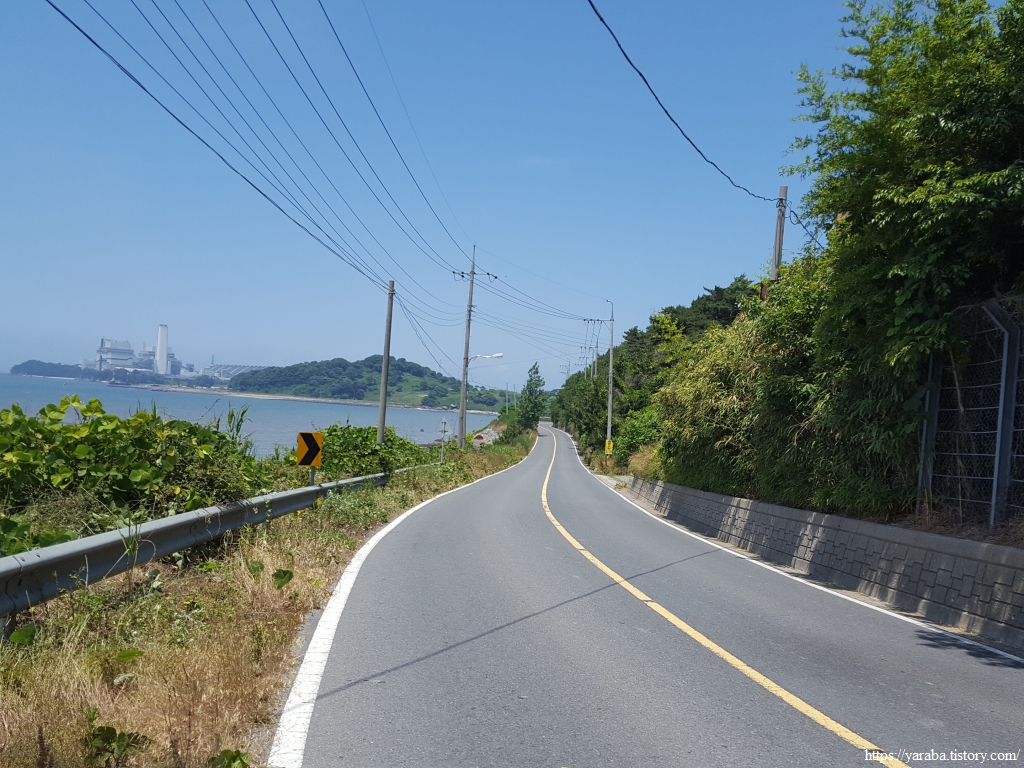 고개를 넘어서니 화력발전소가 더욱 가까이로 다가선다. 도로의 갓길이 넓지 않은 것을 보니 왜 서해랑길 경로를 마을 안쪽으로 돌아가게 했는지가 이해가 된다. 안산마을까지는 길지 않은 거리이므로 부지런히 걸어 도로를 벗어난다. 안산 마을 앞의 모래 해변도 일품이다.