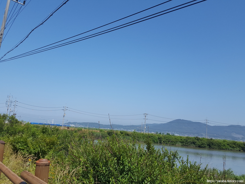 산 아랫자락을 따라서 돌아가는 길 끝에는 송학천을 가로막은 방조제가 있었는데 한참 도로 공사 중이었다.