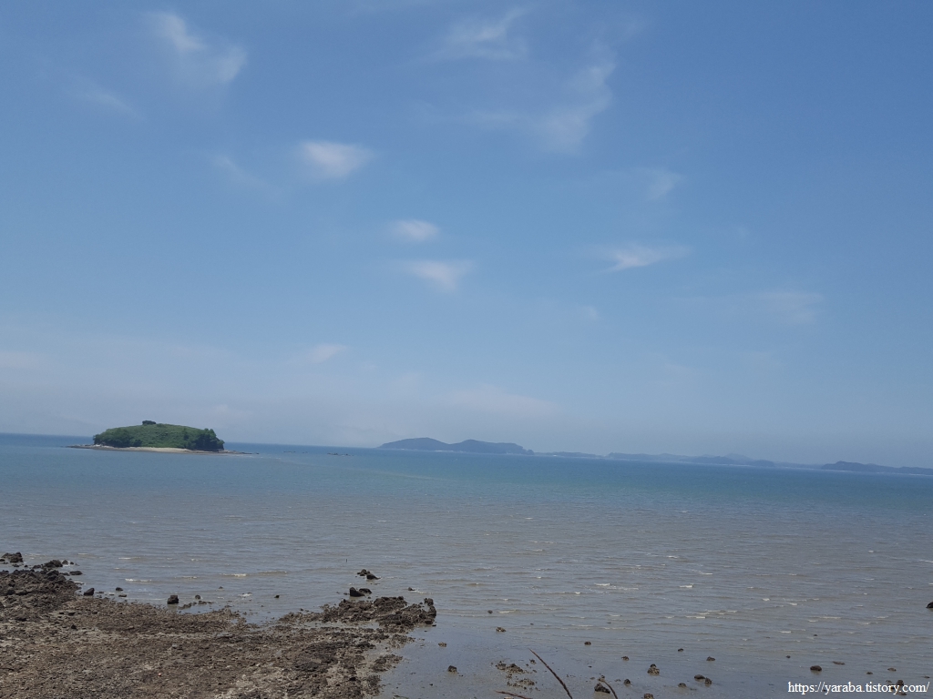 정면으로는 화력발전소의 굴뚝을 보면서 바다 쪽으로는 작은 대섬을 보며 걷는 길이다. 해변 모래사장이 유독 하얗게 보이는 것이 조개껍질이 많아서인 모양이다.