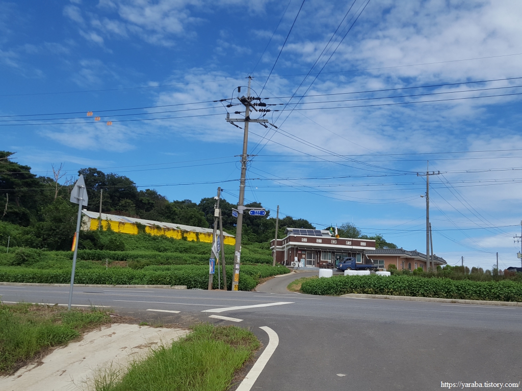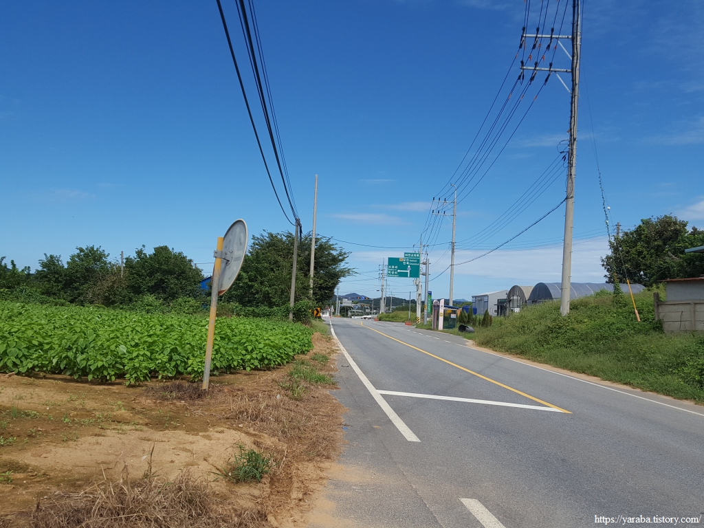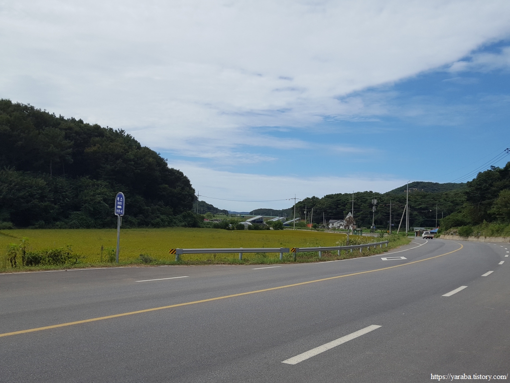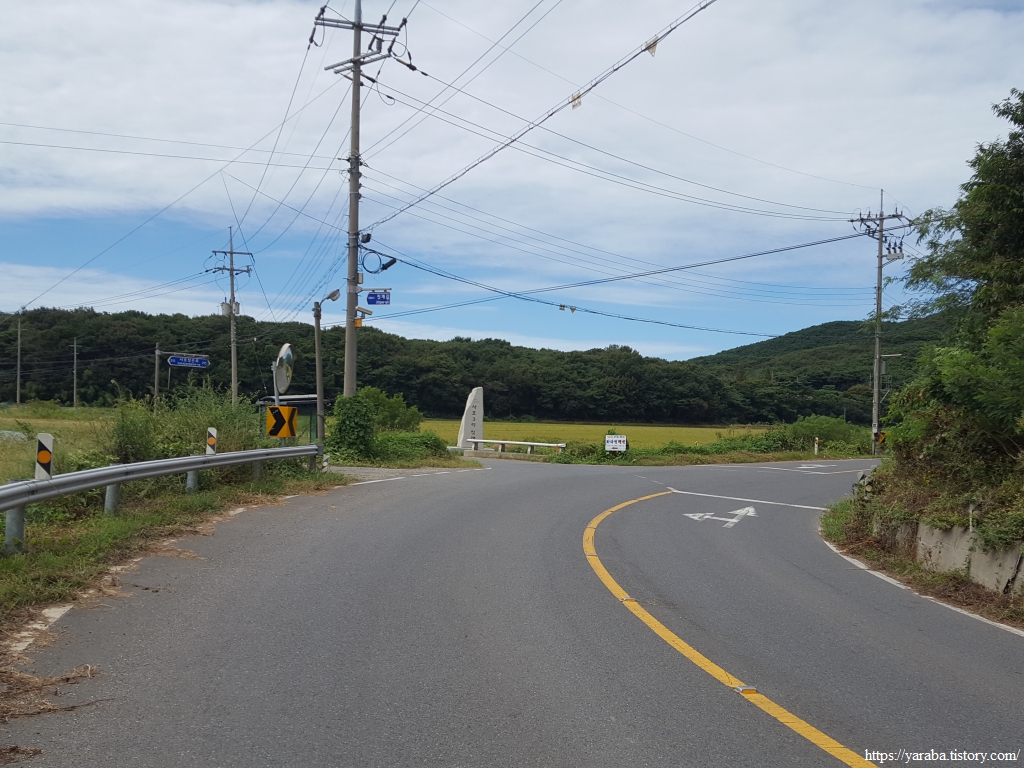 사호리로 갈라지는 하만 교차로 아래에서 국도를 가로지른 길은 구릉지의 마을길을 돌아서 하만 4리로 향한다. 파란 하늘의 흰구름을 보면 영락없는 가을 하늘인데, 왜 이리 찌는듯한 날씨인지 동행하고 있는 젊은이들이 맥을 못 춘다. 물을 넉넉히 챙겨 오기는 했지만 62코스 경로 상에 물을 보충할 만한 곳이 없기 때문에 이 또한 비상이다.