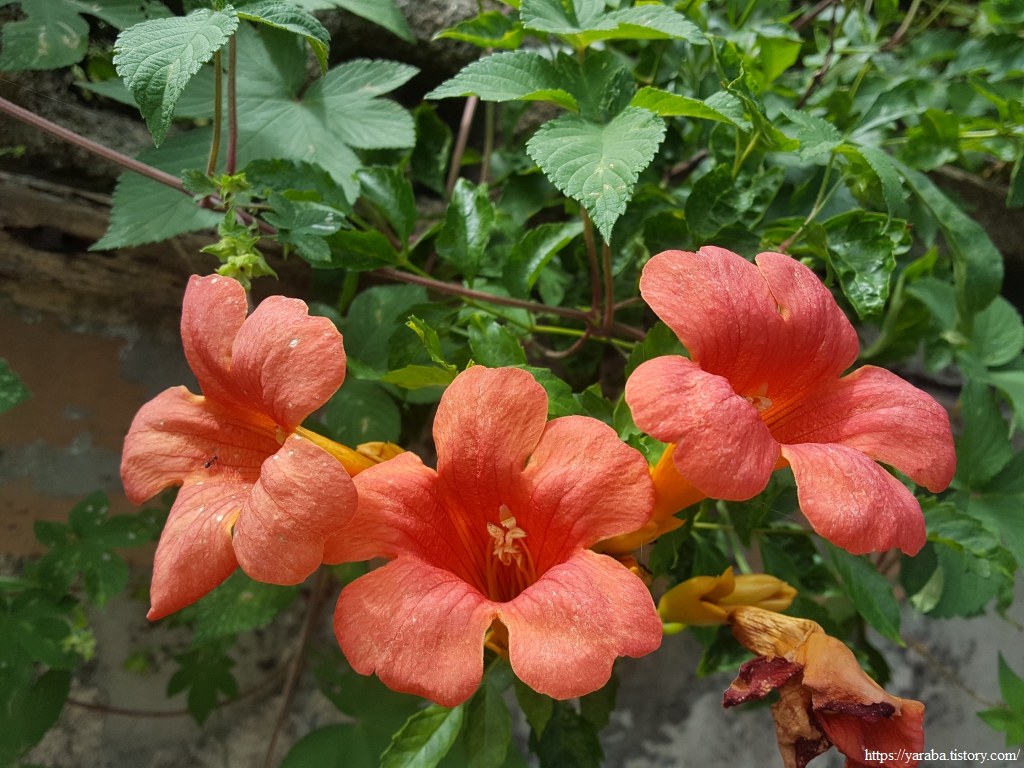 대표적인 여름꽃 중의 하나인 능소화가 허물어져가는 가옥을 붙들고 아름다움을 전한다. 집이나 사람이나 살지 않거나 관리하지 않으면 점점 더 낡아갈 수밖에 없지만 자연의 식물들은 낡고 늙어가는 것이 대수롭지 않은 모양이다.